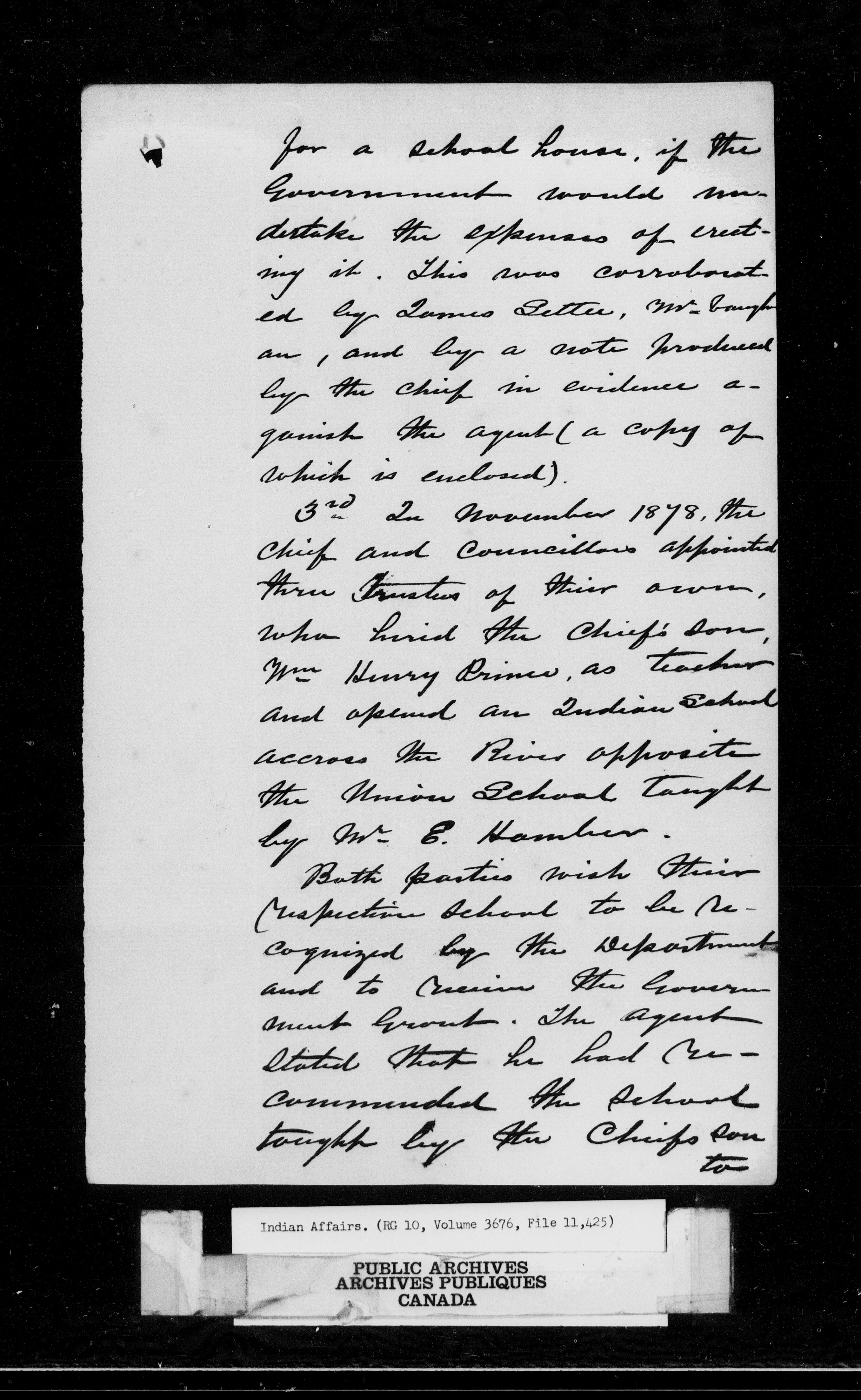 Northwest Territories - Appointment of agents and the establishment of various agency buildings, 1884-1885|Northwest Territories - Conditions of the Blackfoot Indians and erection of variou agency buildings, 1879-1889|Northwest Territories - Appointment of agents and erection of agency buildings, 1887-1888|Blackfoot Agency - Personnel file of G.W. Wheatley, 1883-1884|Sarcee Agency - Personnel file of Farming Instructor Scott, 1884|Northwest Superintendency - Superintendent G. Dickinson stating that there may be trouble among the Indians due to starvation, 1878-1879|West Coast Agency - Location of artillery barracks on the reserve near Victoria, 1884-1886|British Columbia - Report of Indian Reserve Commission on the administration of Indian Affairs, 1878-1879|Northwest Territories - Quarterly returns of farms and agencies, 1884|Returns on farms in the Northwest Territories, 1884|Northwest Territories - Charges against Reverend Father Constantine Scollen, 1883-1884|Portage La Prairie Agency - Straightening the road on Long Plain Reserve, 1884|Northwest Territories - Sketch of reserves in the Lonely Lake area, 1884|The Pas Agency - Request from The Pas Band to receive the balance of their reserve, 1884|Headquarters - Resignation of Indian Superintendent David Laird, 1879|Northwest Territories - Request from Lieutenant Governor and the Indian Superintendent for funds to supply the Indians, 1879|Northwest Territories - Requests for reserves for White Cap and Standing Buffalo, 1879-1881|British Columbia - Report of the death of the Chief of the Okanagan Band, 1879|Northwest Territories - Appointment of agents for Treaty 6, 1879|Northwest Territories - Study of American Indian School and subsequent report by E. McColl with recommendations for Canadian Indian Schools, 1879-1901|Qu'Appelle Agecny - Establishment and administration of High River Industrial School, 1884|Northwest Territories - Construction of schools at High River and Battleford (plan), 1884|Northwest Territories - School land and administration at High River and Qu'Appelle, 1885|Northwest Territories - Administration of Qu'Appelle and High River Industrial Schools, 1885-1891|Battleford Agency - Battleford Industrial School - Administration, 1884-1894|Appointment of agents in the Clandeboye Agency, 1879-1895
