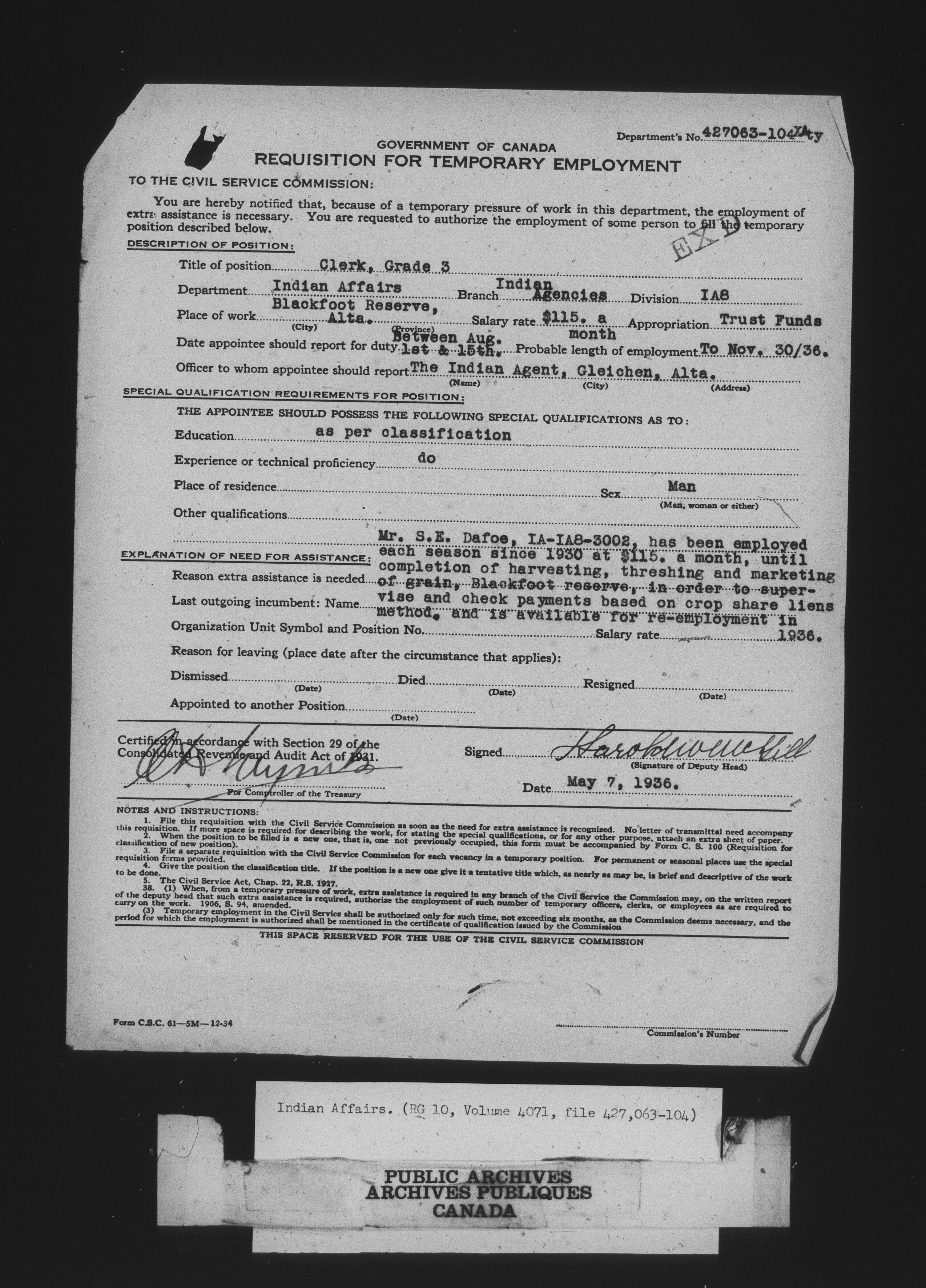 Blackfoot Agency - Personnel file of Mr. Samuel Elliot Dafoe, clerk, grade 3, 1925-1941