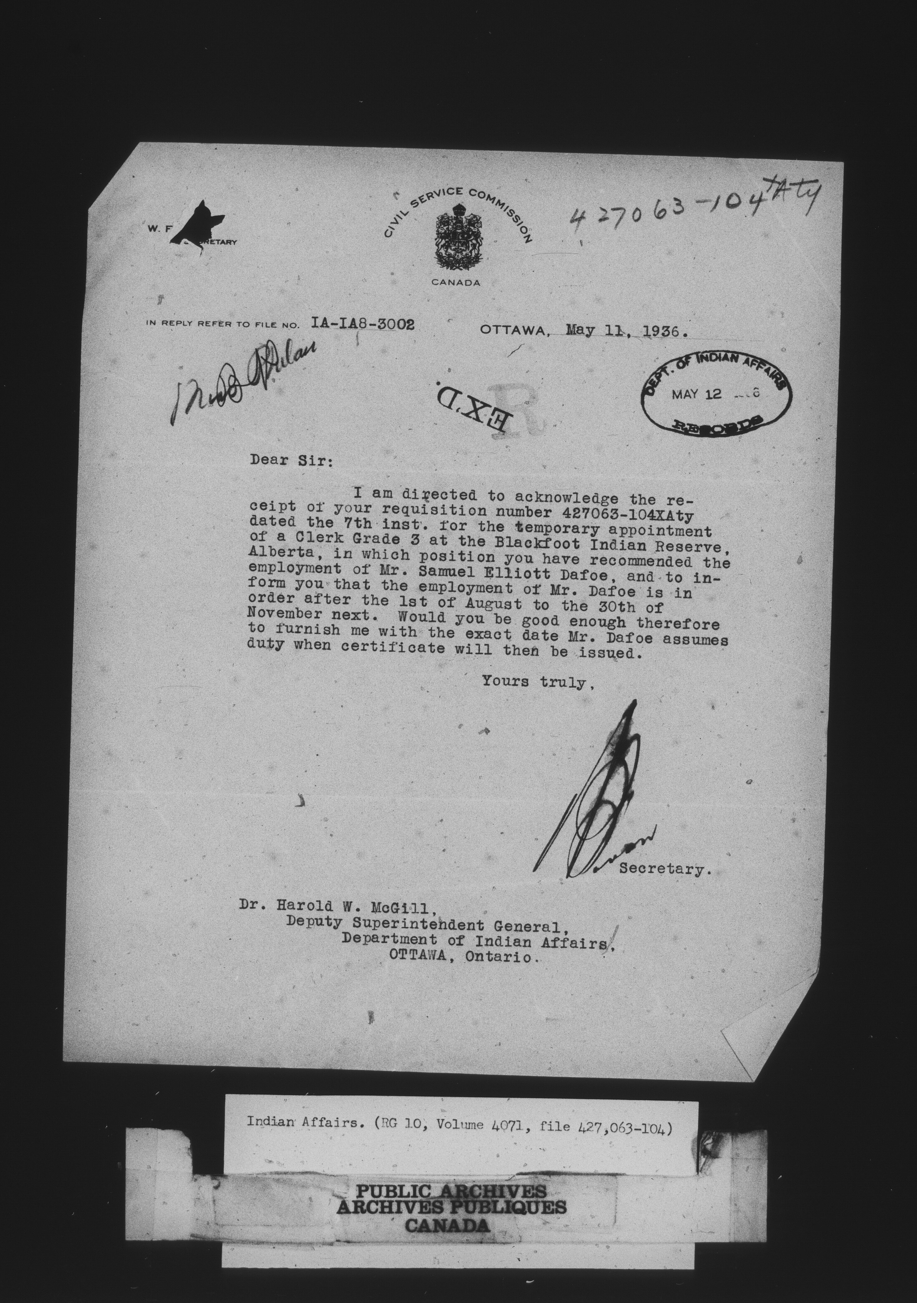 Blackfoot Agency - Personnel file of Mr. Samuel Elliot Dafoe, clerk, grade 3, 1925-1941