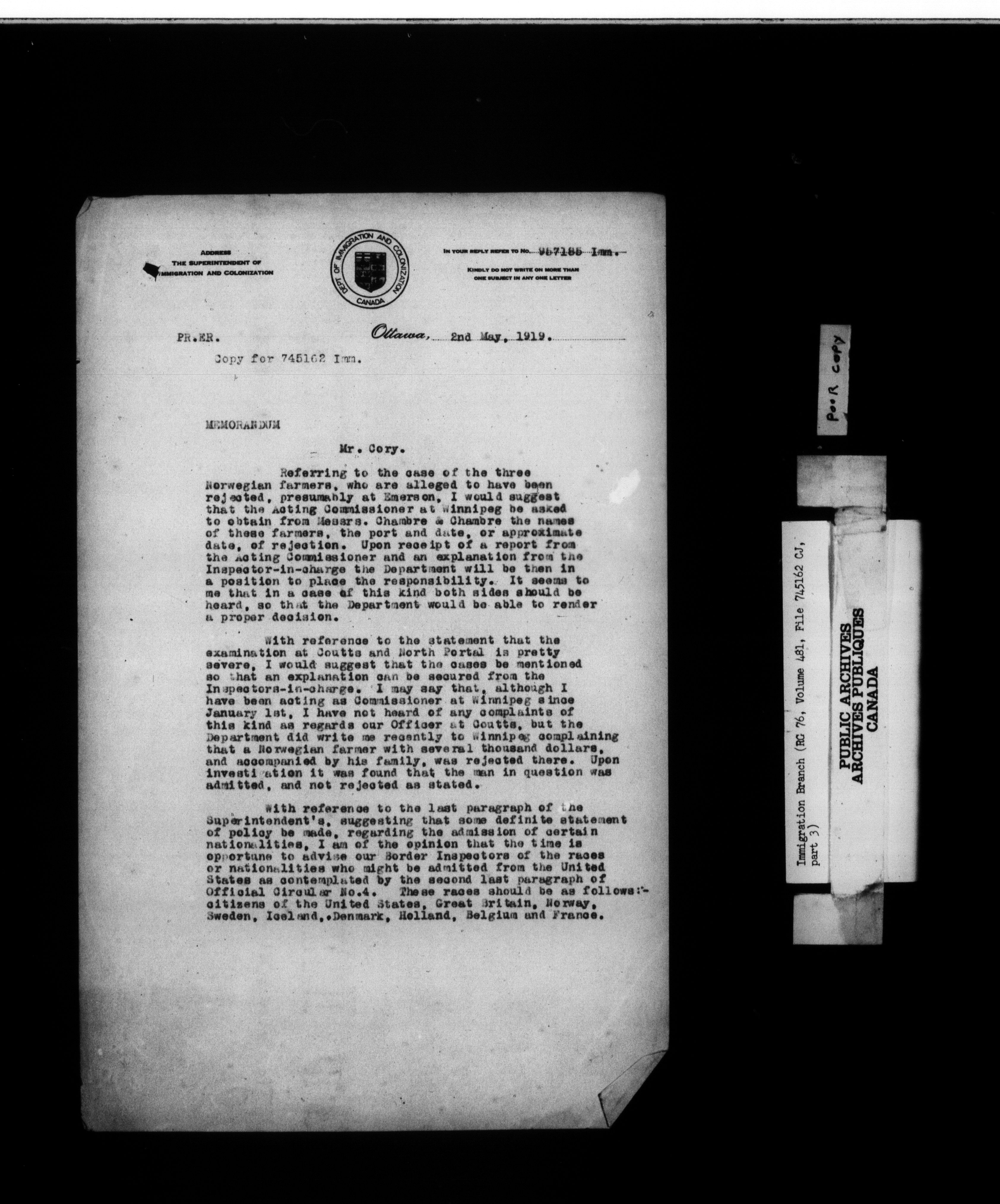 Subject, policy and case files in the First Central Registry series of the Immigration Program, 1892-1950 - 10416