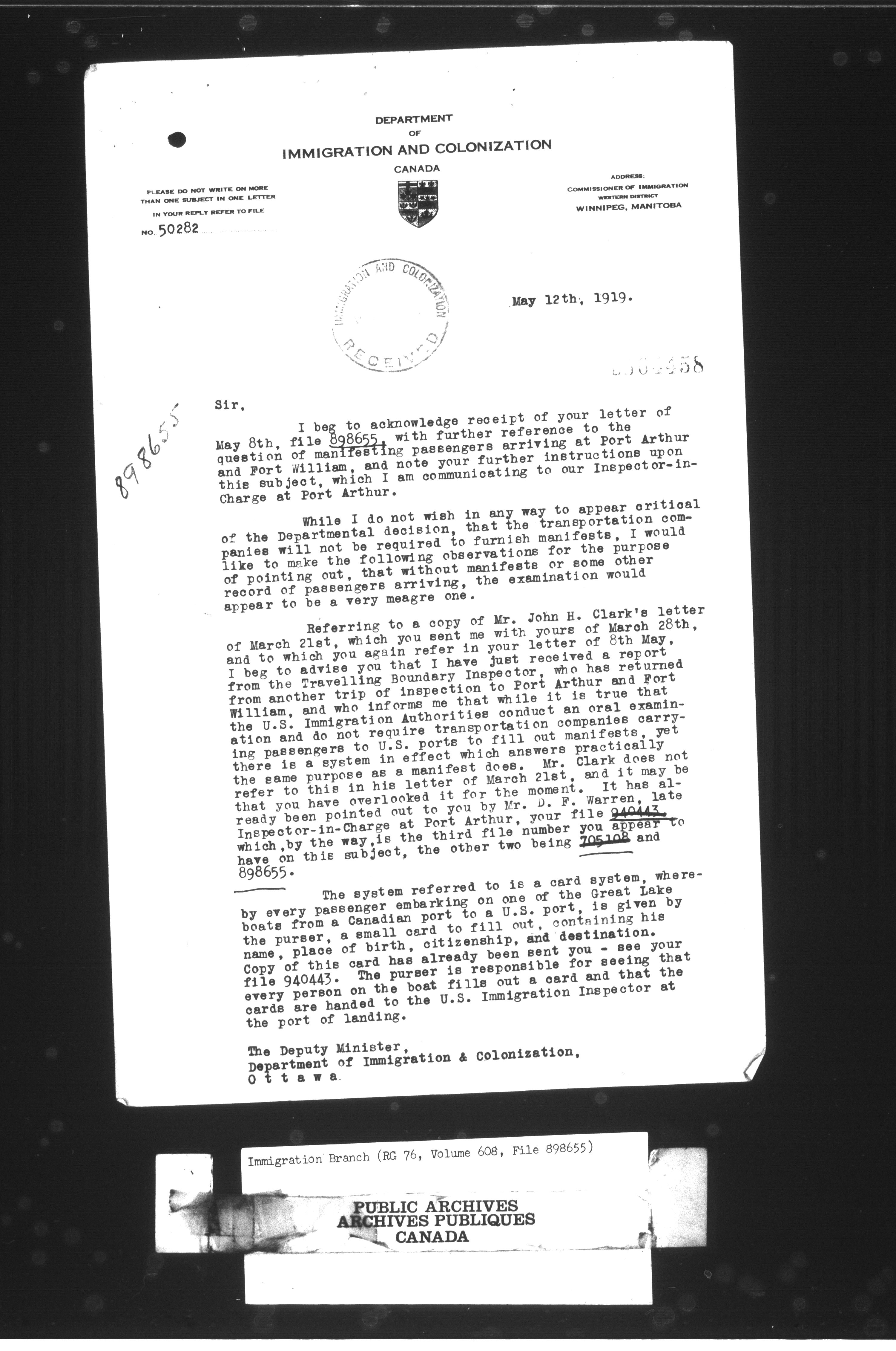 Subject, policy and case files in the First Central Registry series of the Immigration Program, 1892-1950 - 10431