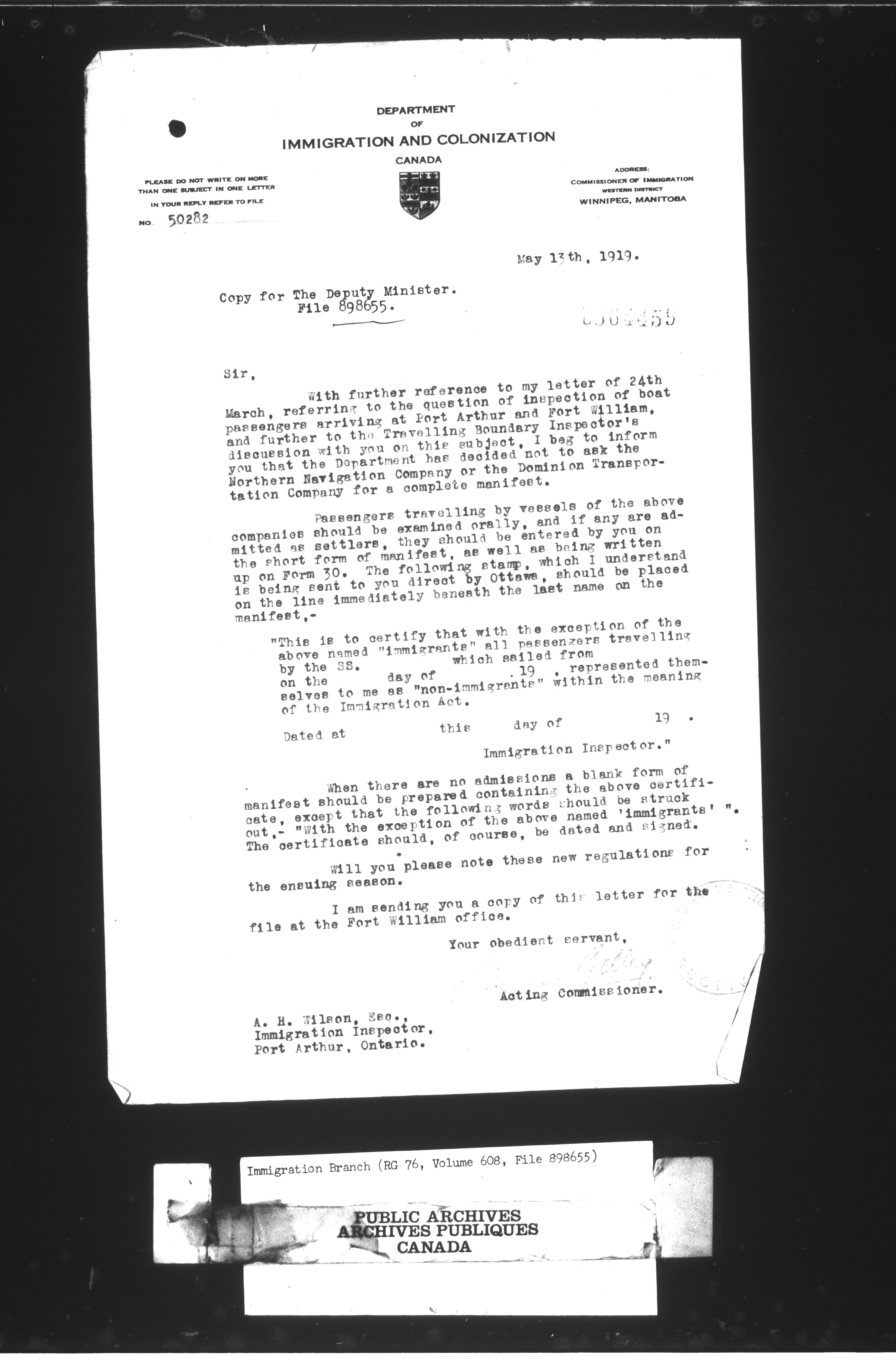 Subject, policy and case files in the First Central Registry series of the Immigration Program, 1892-1950 - 10431