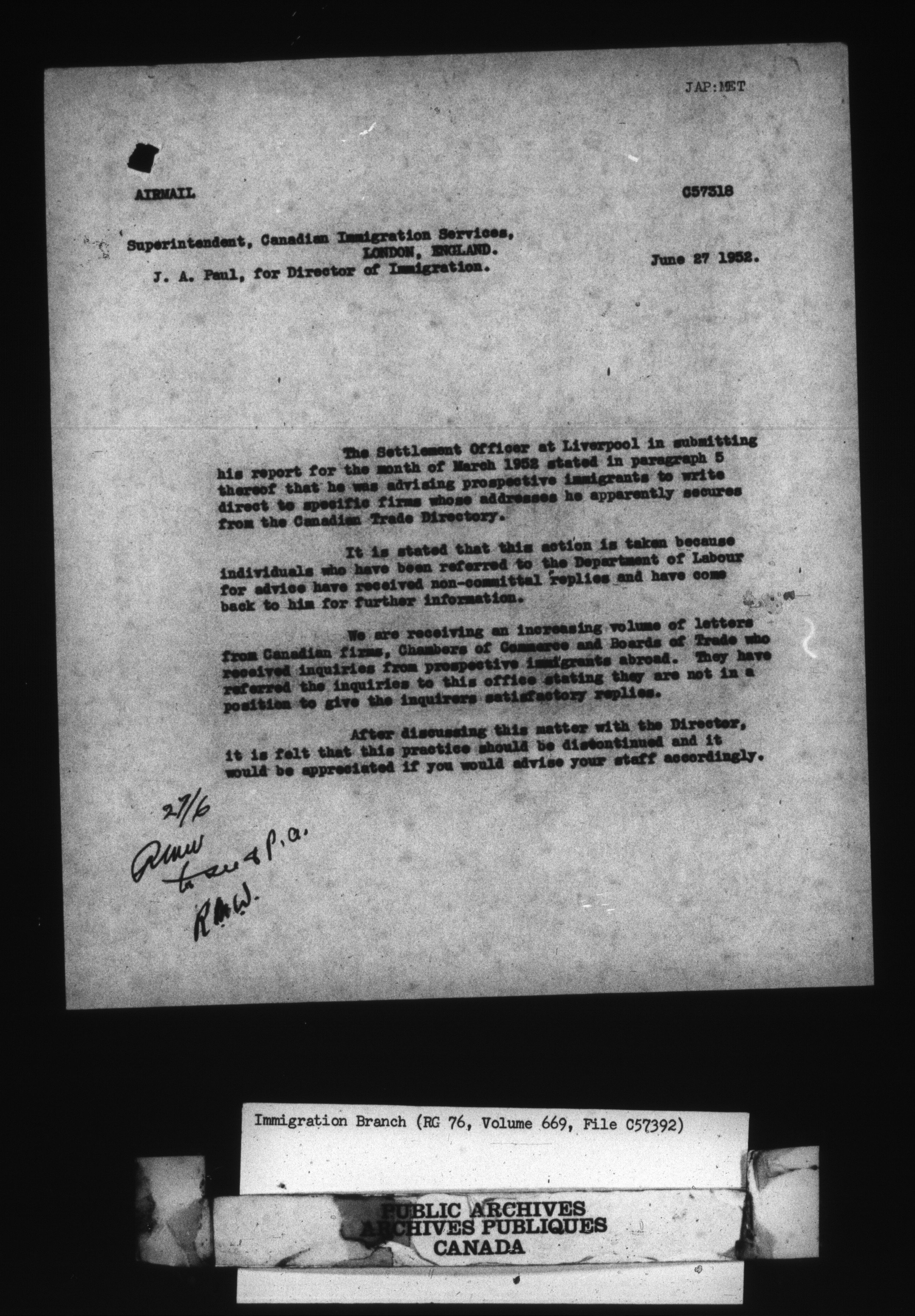 Subject, policy and case files in the First Central Registry series of the Immigration Program, 1892-1950 - 10603