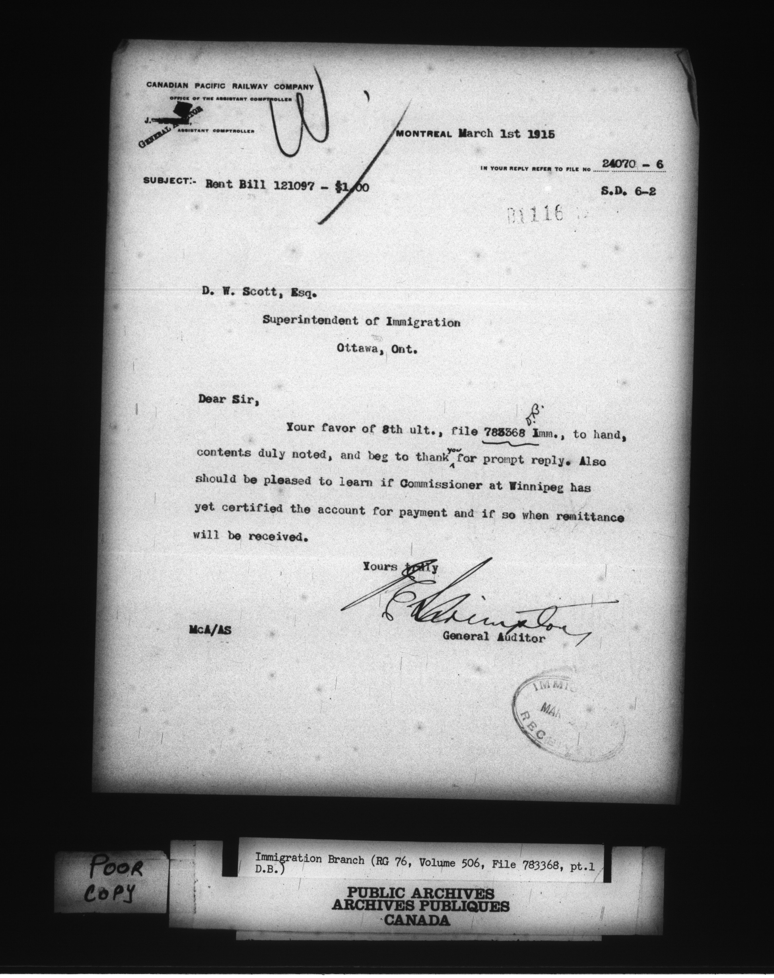 Subject, policy and case files in the First Central Registry series of the Immigration Program, 1892-1950 - 10607