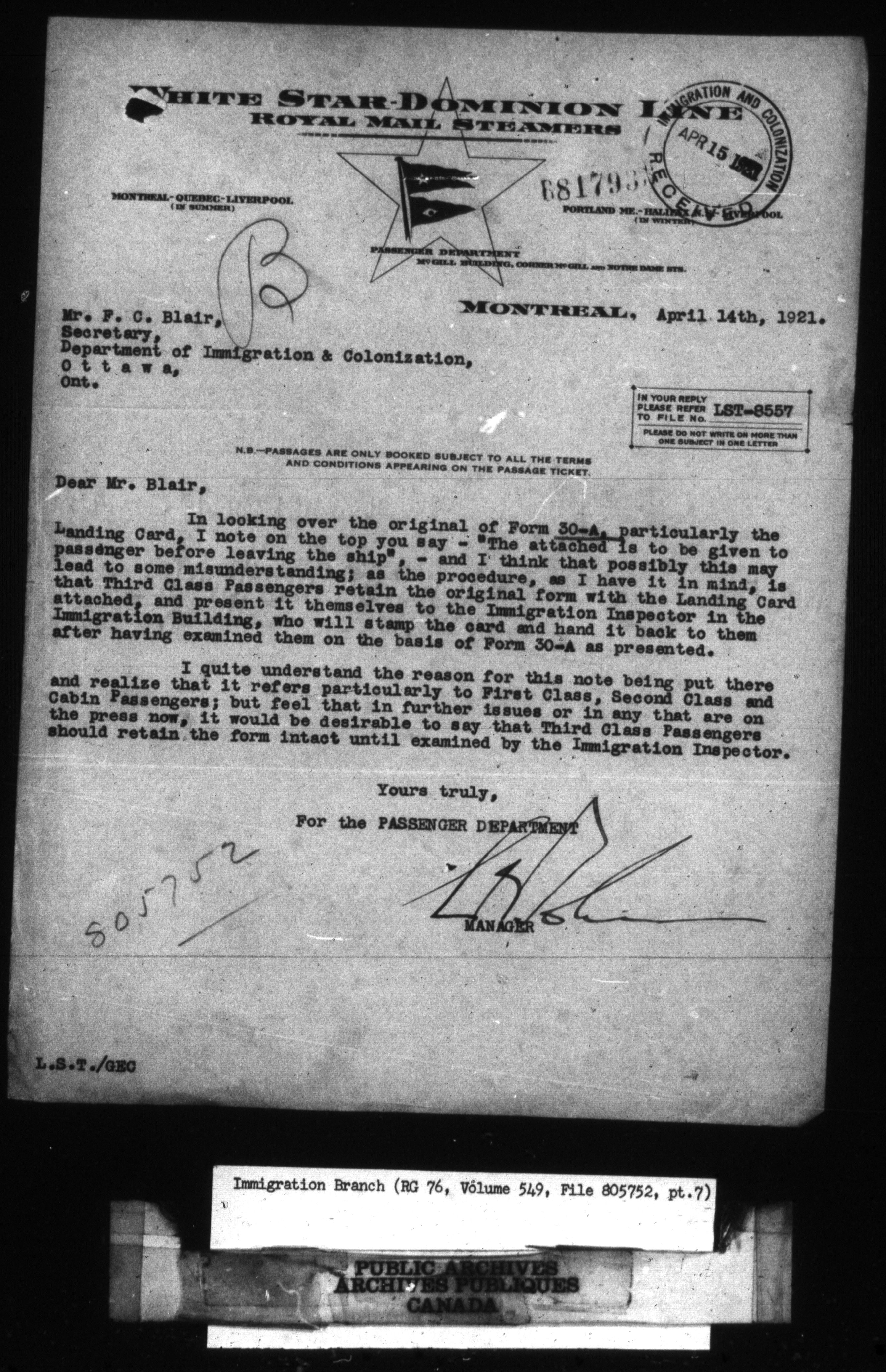 Subject, policy and case files in the First Central Registry series of the Immigration Program, 1892-1950 - 10634
