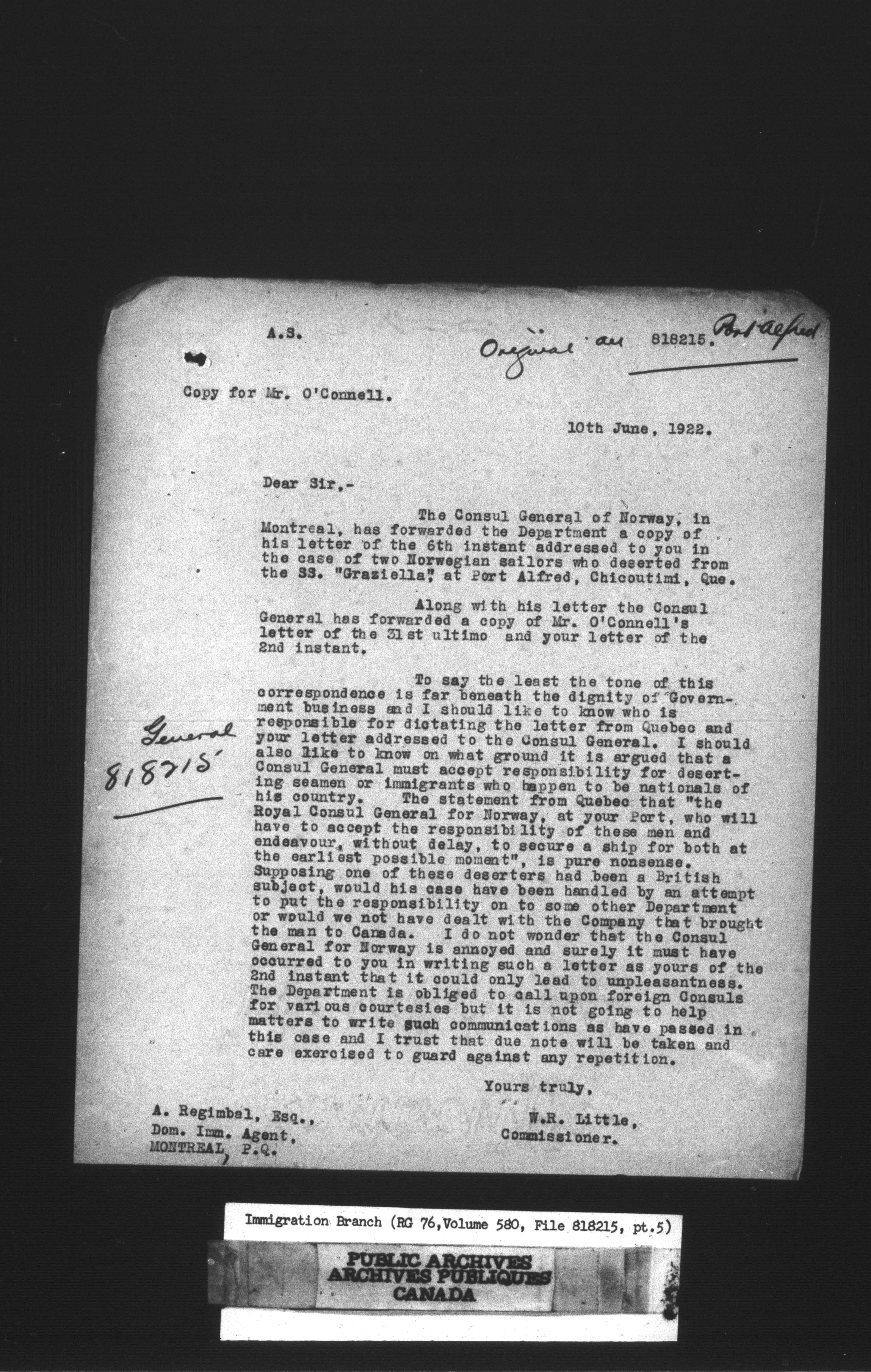 Subject, policy and case files in the First Central Registry series of the Immigration Program, 1892-1950 - 10655