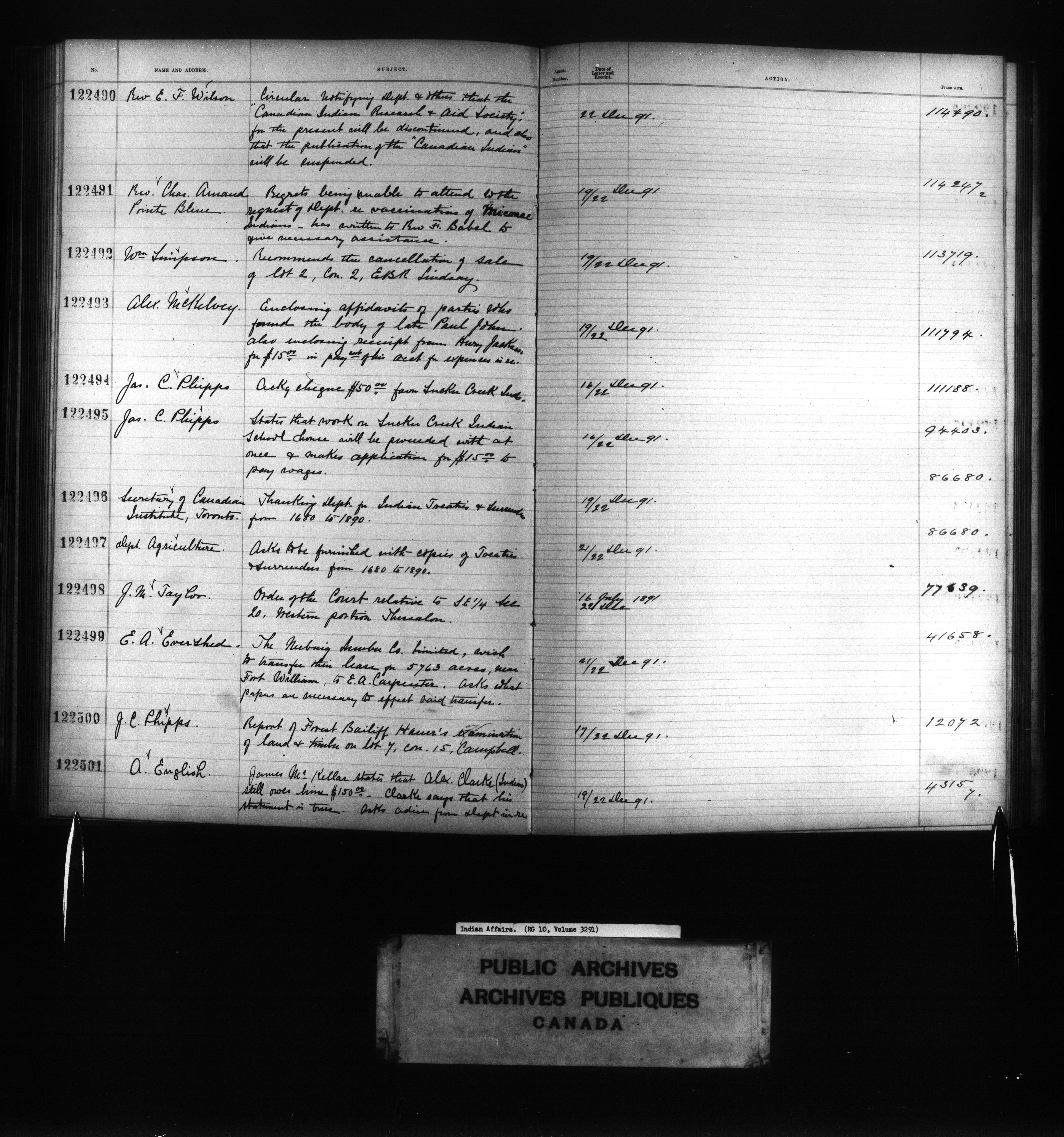 Department of Indian Affairs, Headquarters central registry system :registers, indices and indexed registers : C-10727