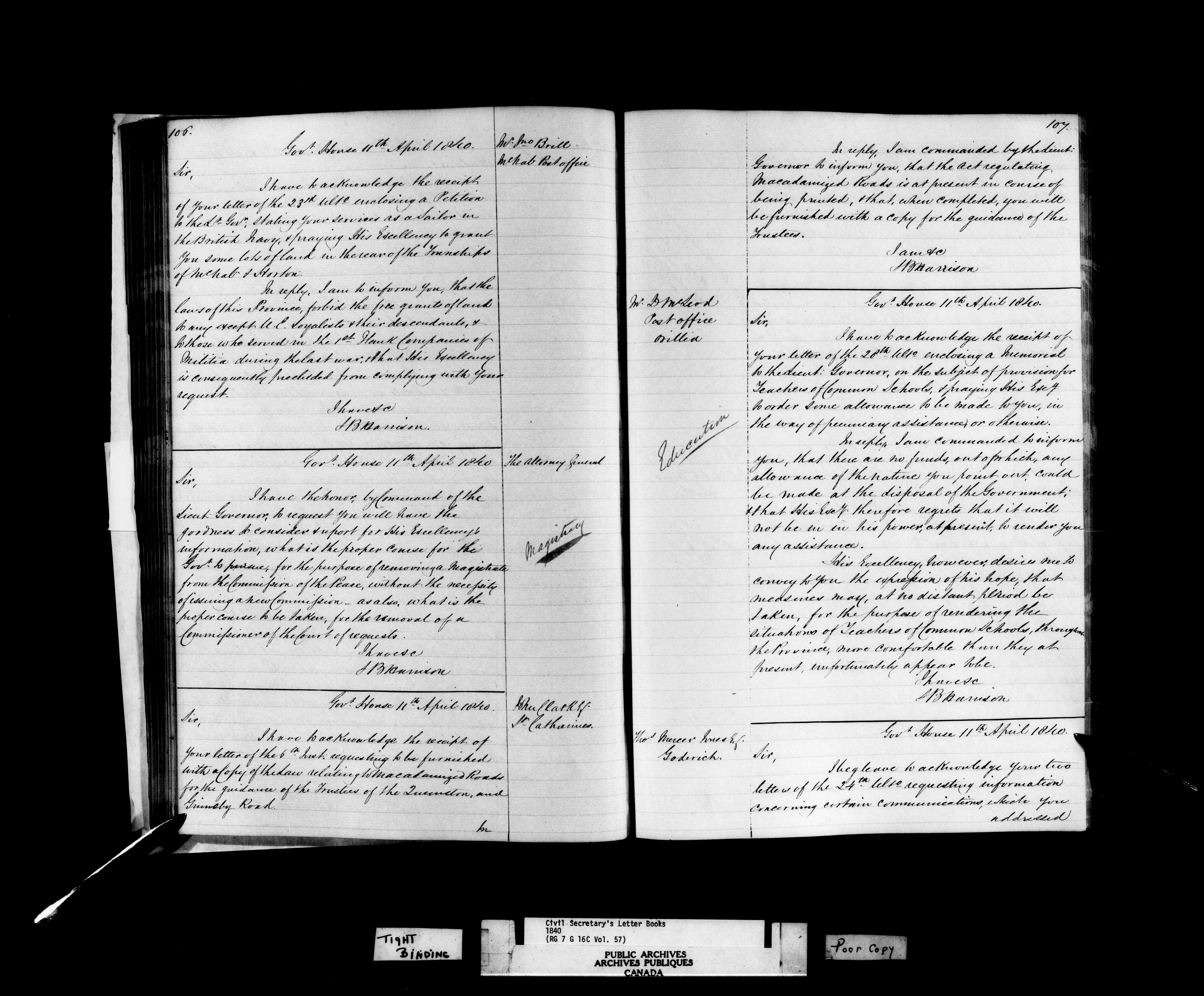 Canada, Governor General's Office, Civil Secretary's Letterbooks, Upper Canada - C-10797