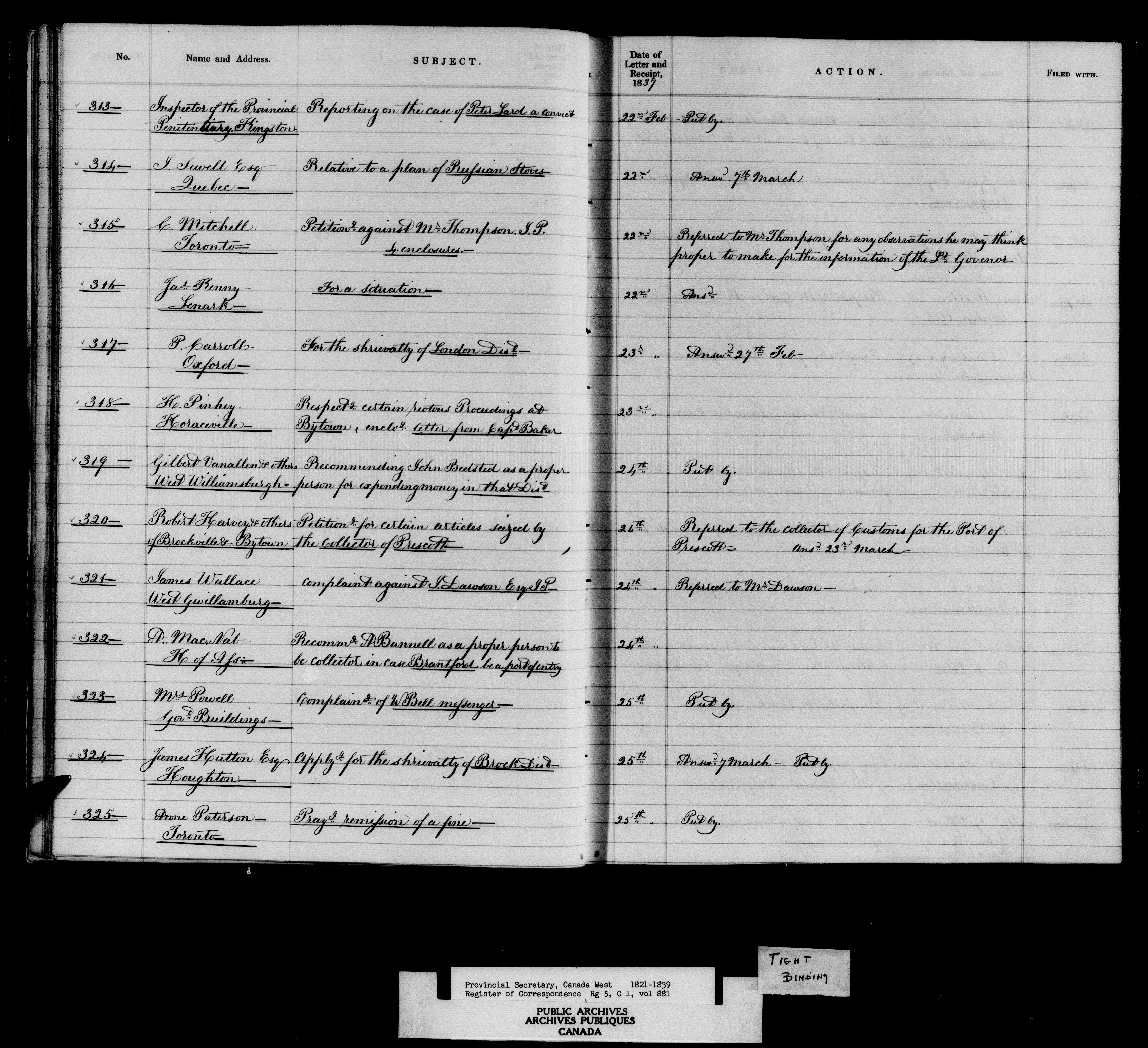 Canada West : Provincial Secretary, numbered correspondence files, 1844 to 1867 : C-10801