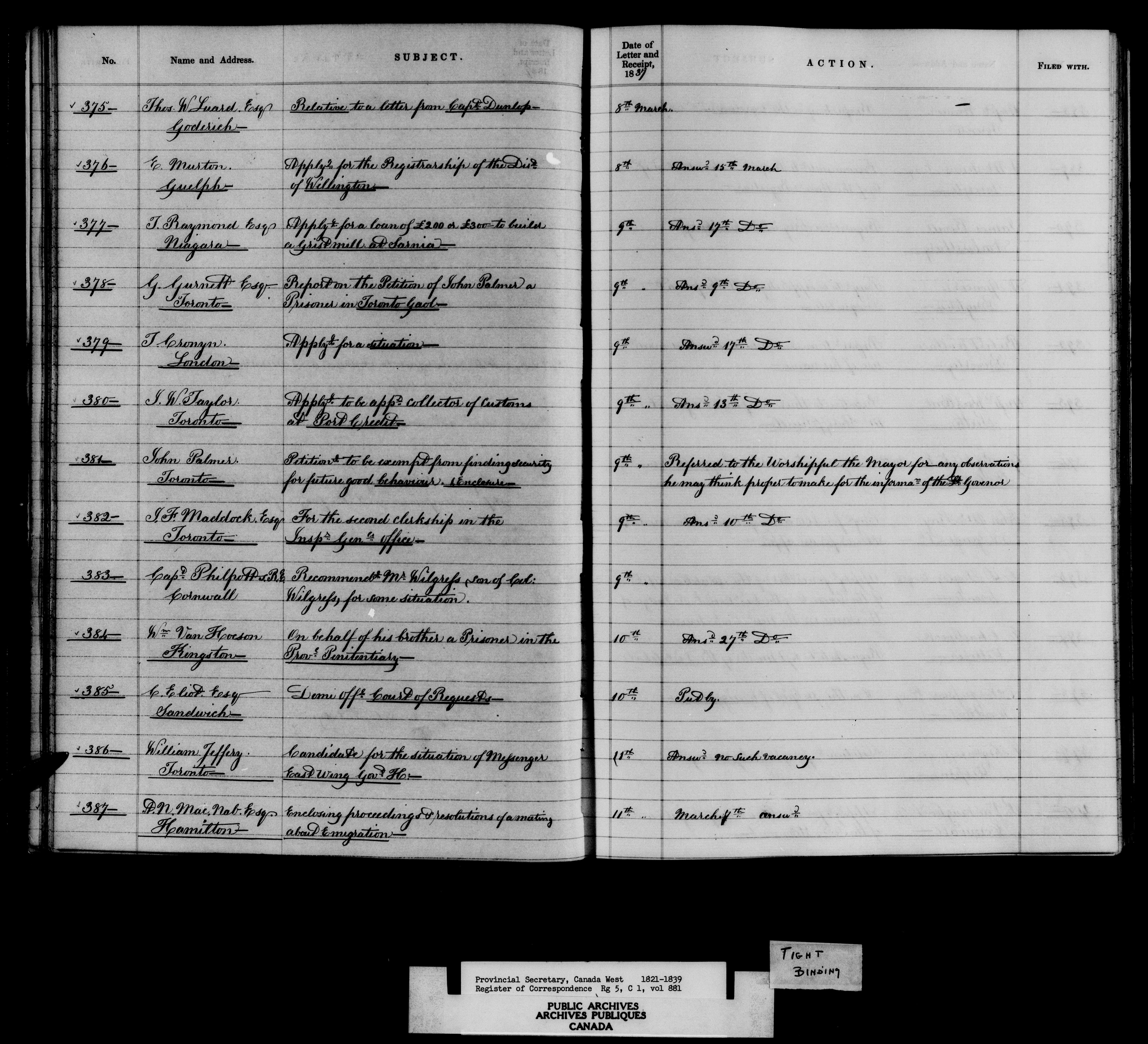 Canada West : Provincial Secretary, numbered correspondence files, 1844 to 1867 : C-10801