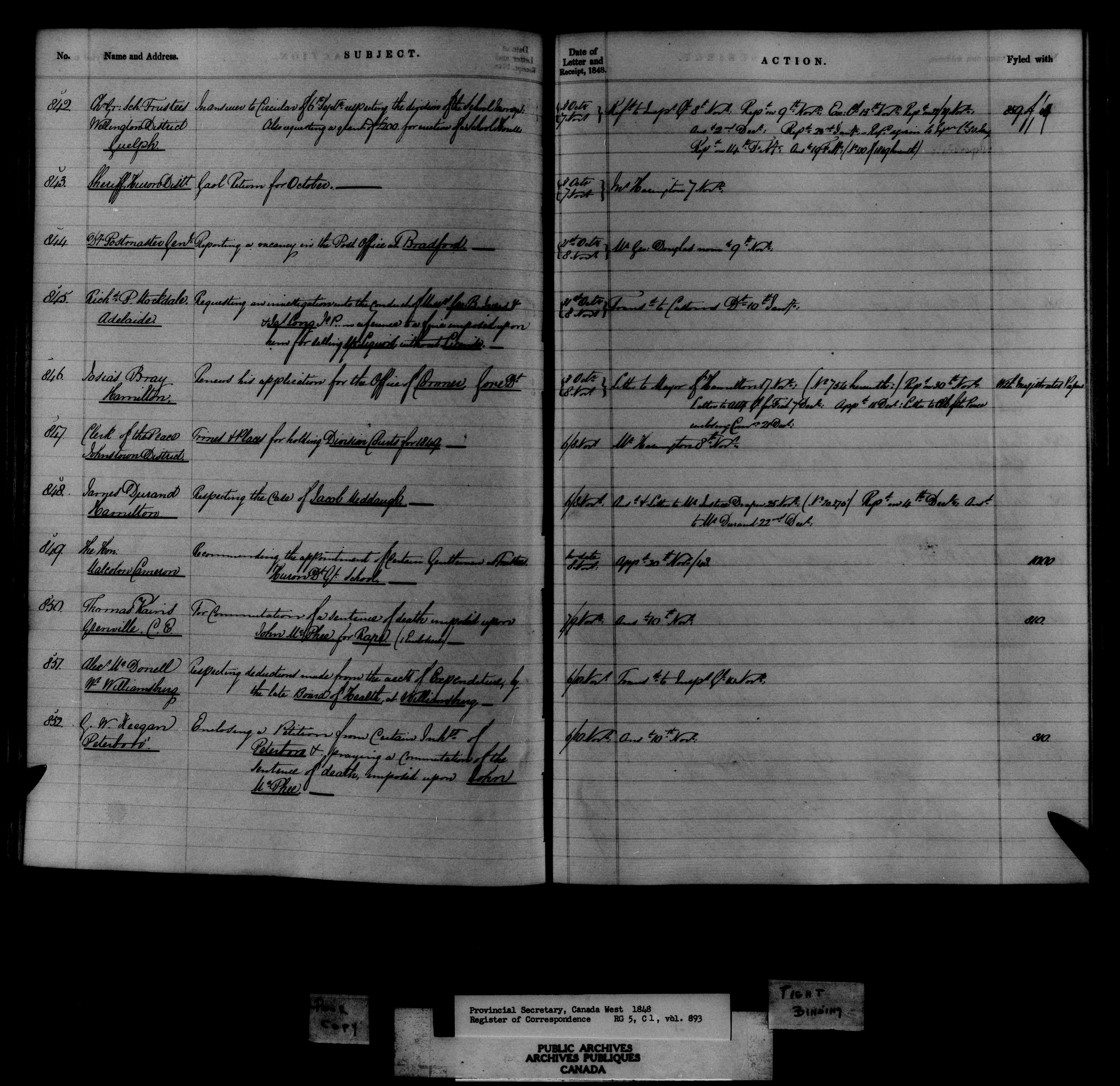 Canada West : Provincial Secretary, numbered correspondence files, 1844 to 1867 : C-10803