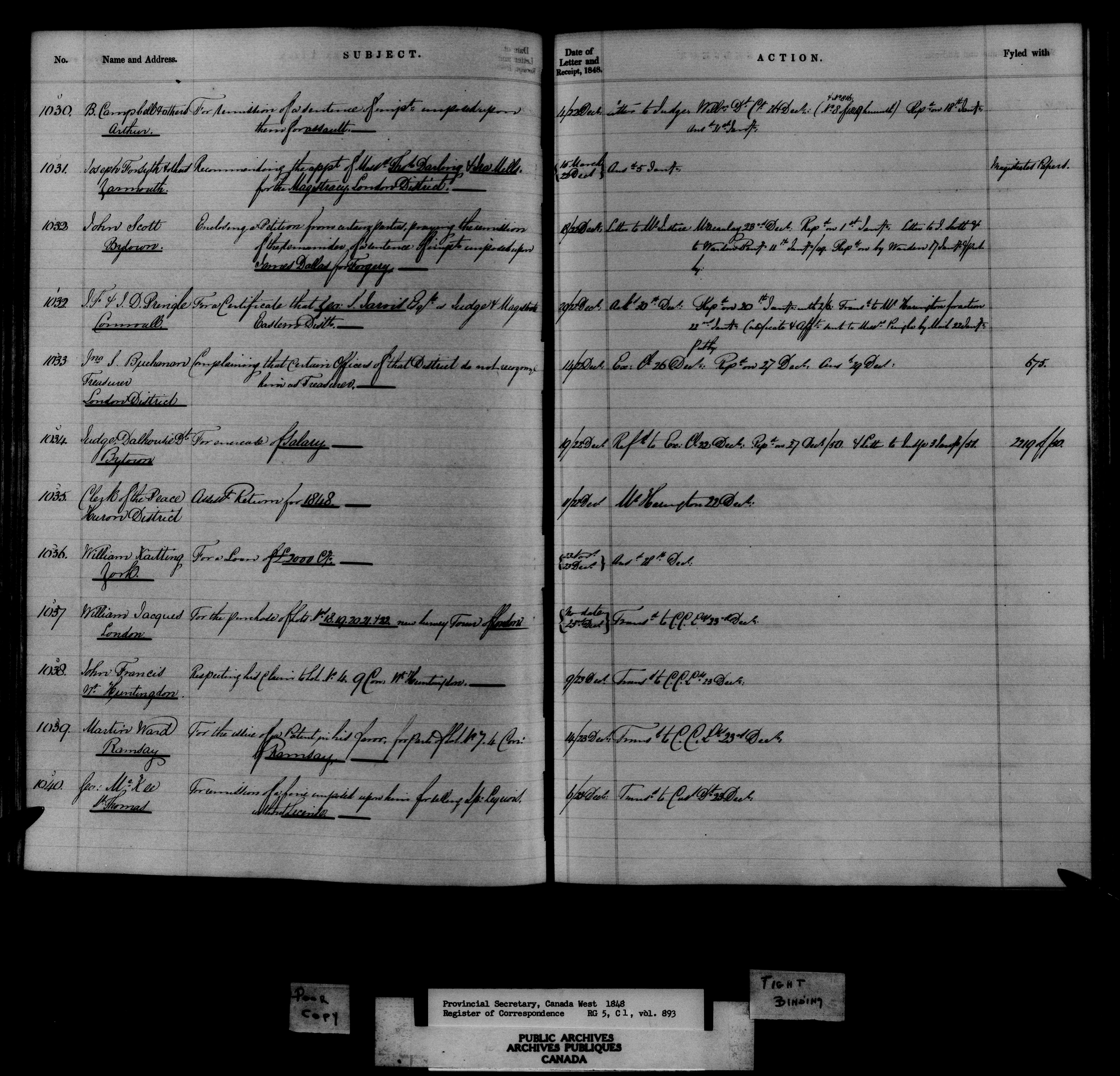 Canada West : Provincial Secretary, numbered correspondence files, 1844 to 1867 : C-10803