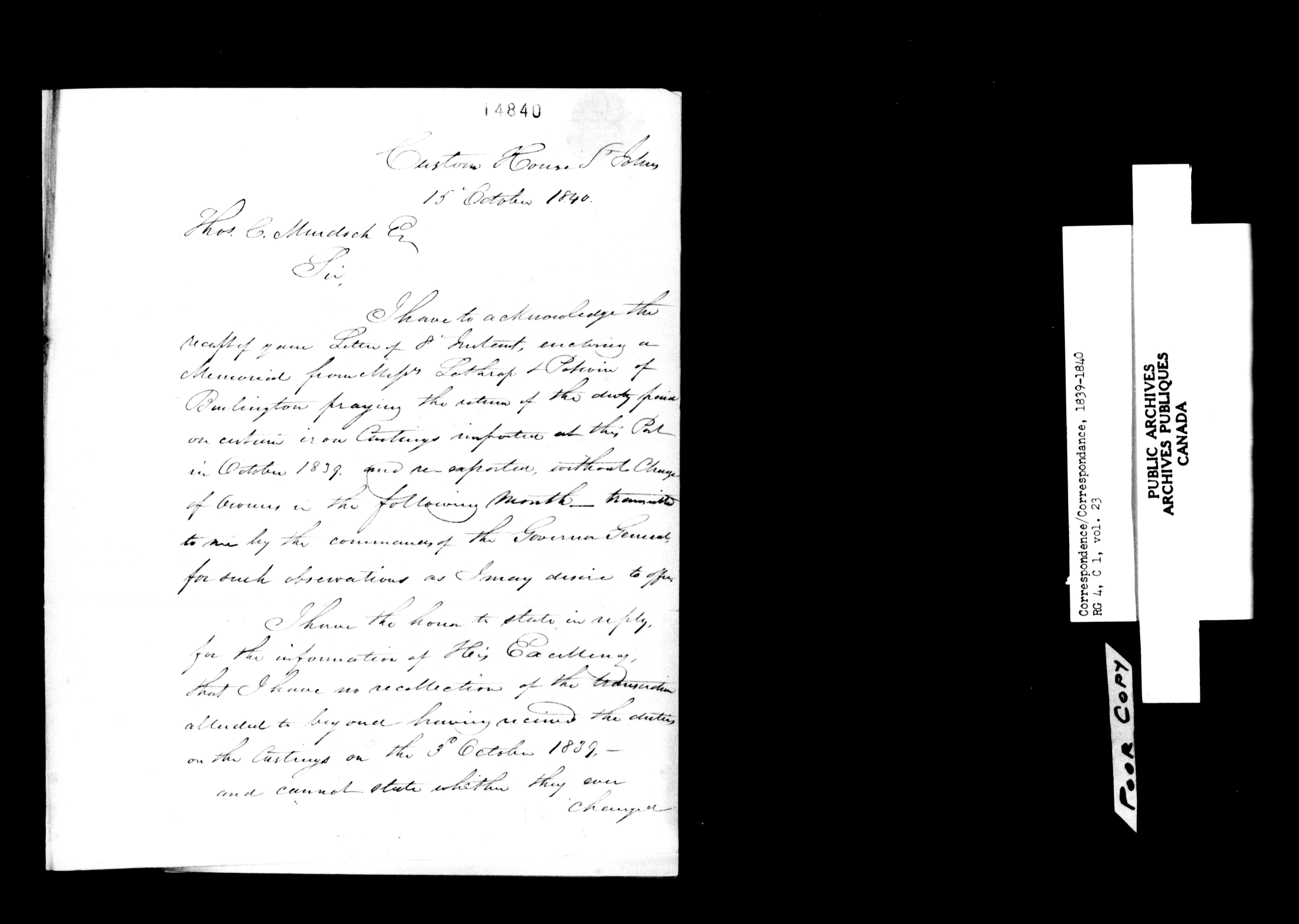 Canada East : Provincial Secretary numbered correspondence files, 1839-1867 : C-10872