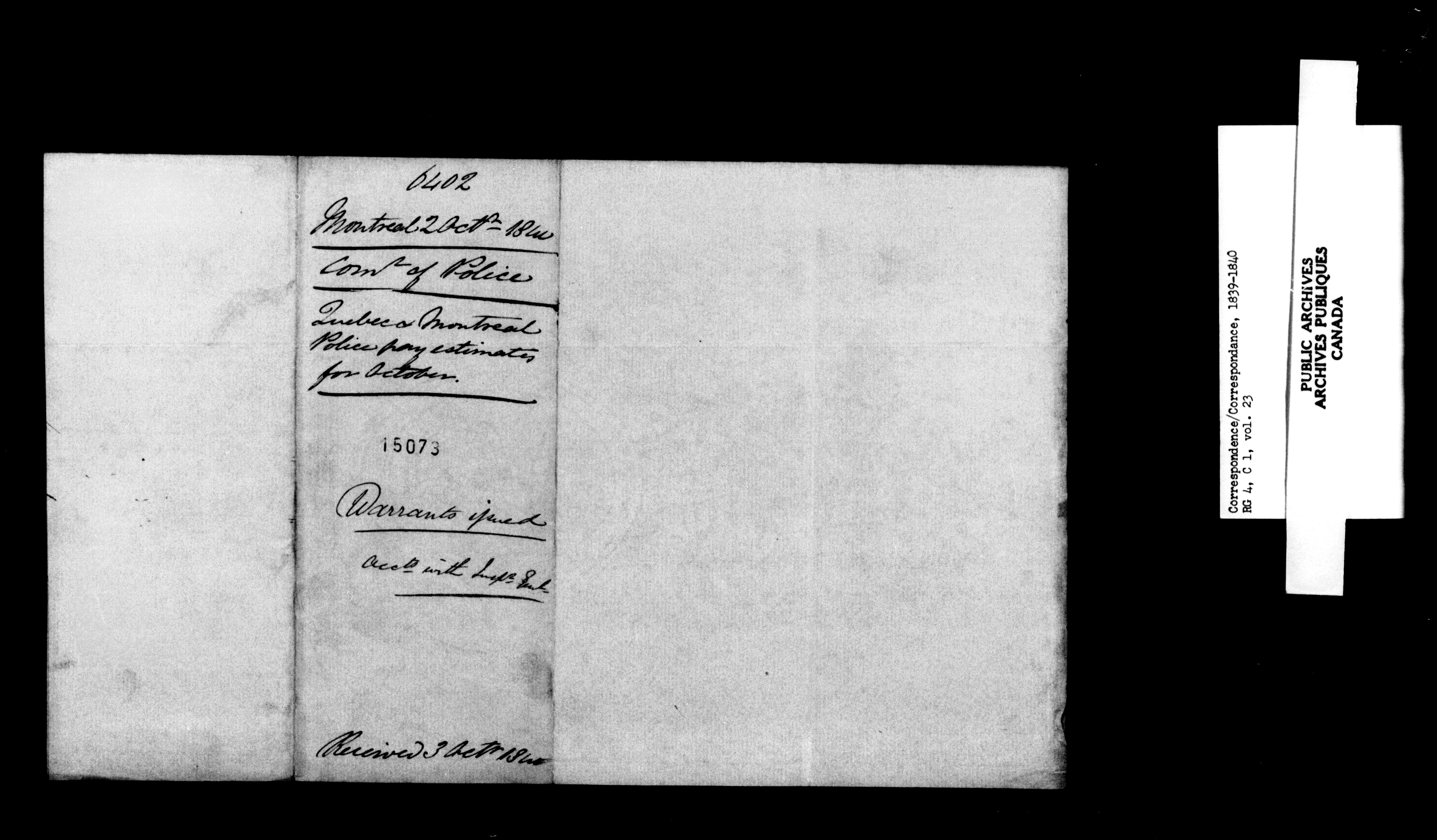 Canada East : Provincial Secretary numbered correspondence files, 1839-1867 : C-10873