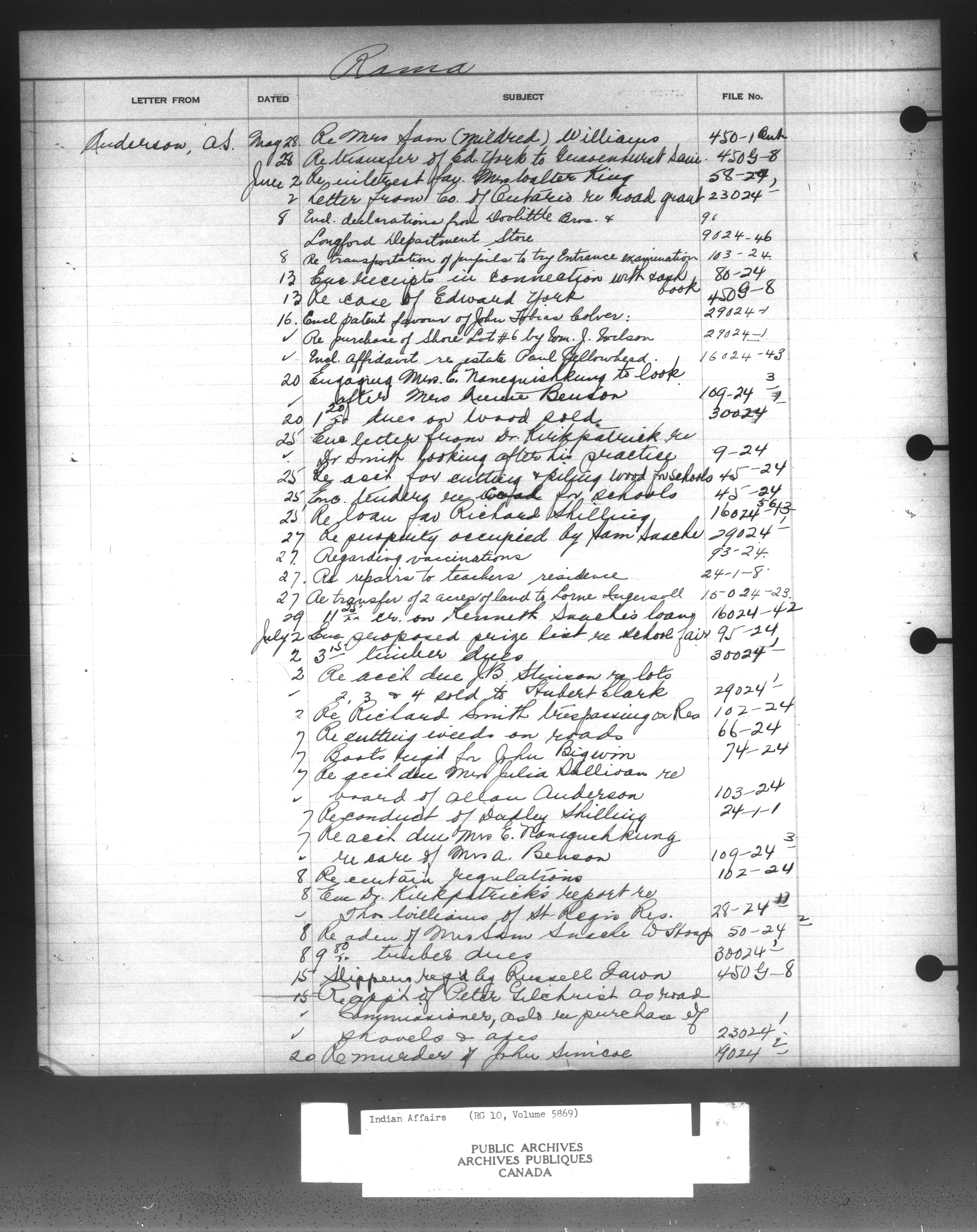 Department of Indian Affairs, Headquarters central registry system :registers, indices and indexed registers : C-10915