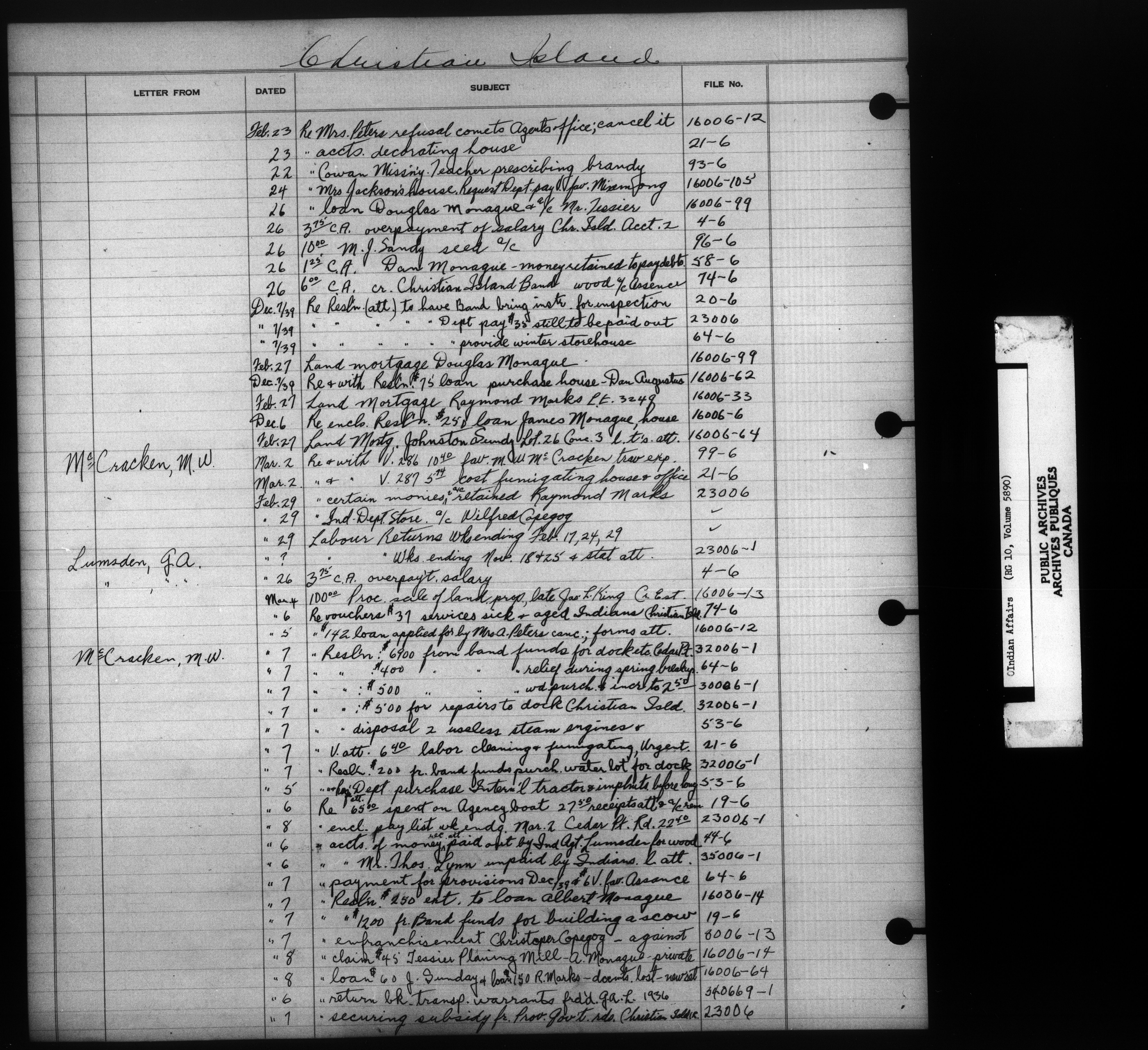 Department of Indian Affairs : Indexed Registers for Eastern Canada - 10924