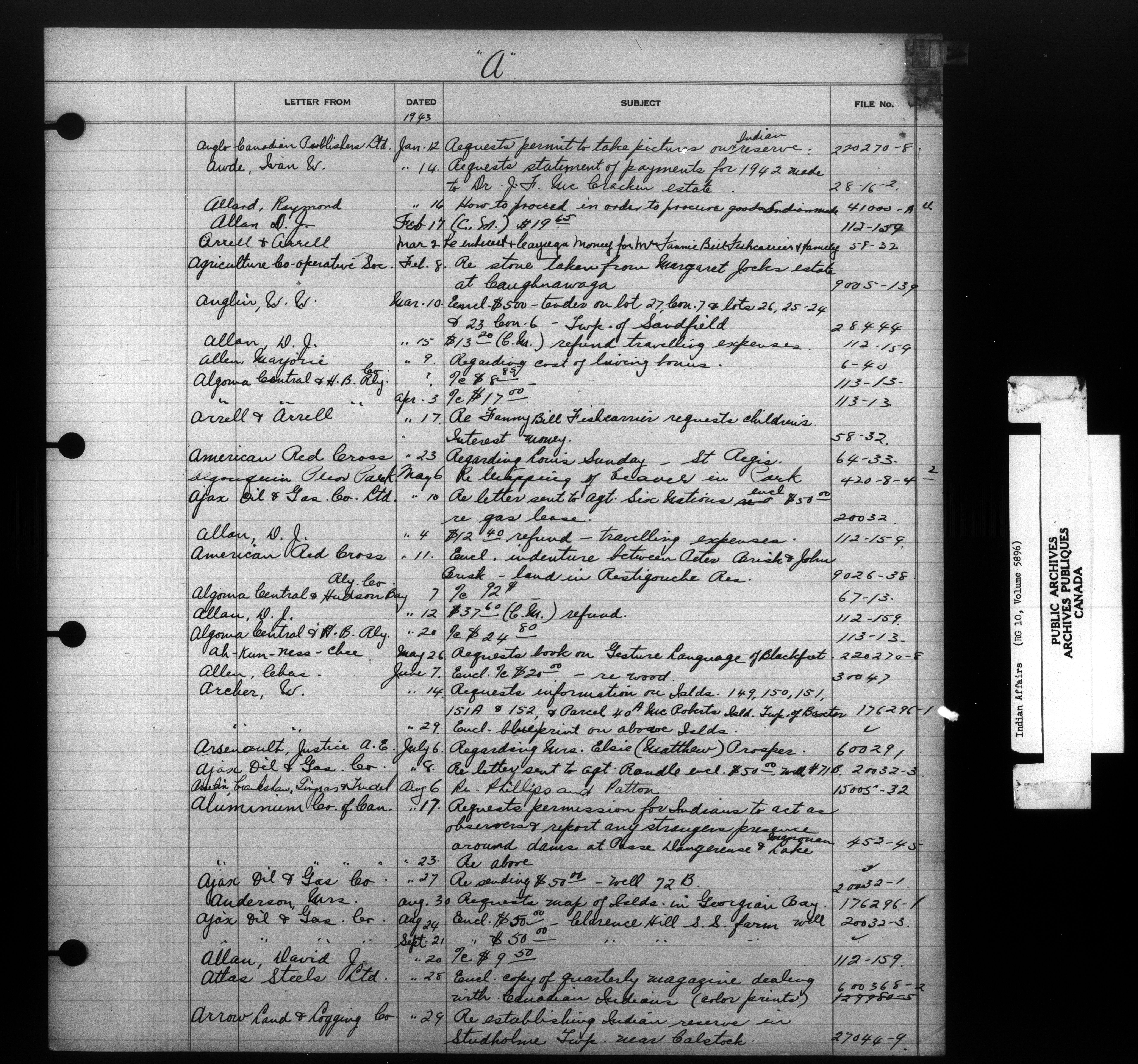 Department of Indian Affairs, Headquarters central registry system :registers, indices and indexed registers : C-10927