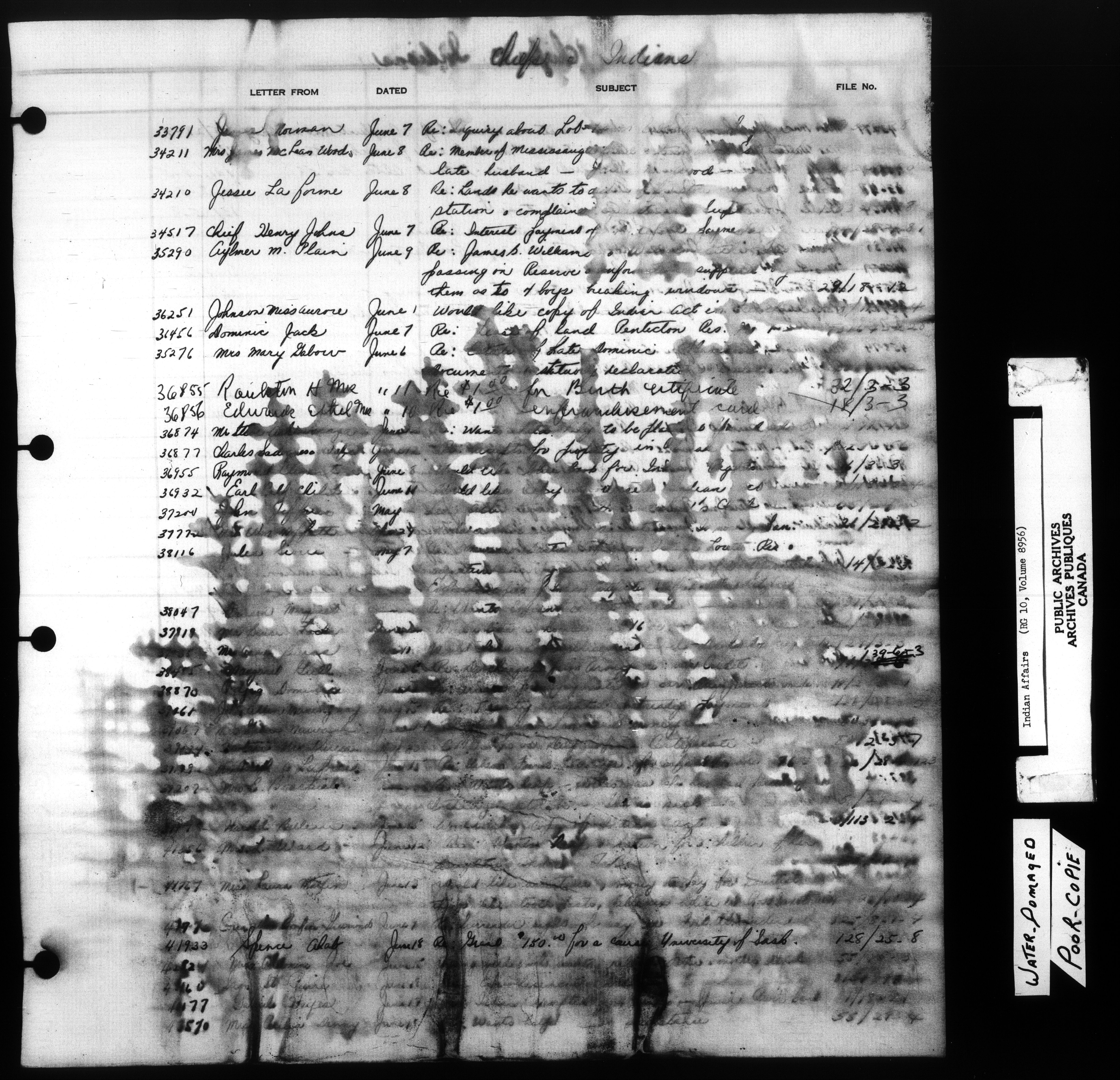 Department of Indian Affairs, Headquarters central registry system :registers, indices and indexed registers : C-10934