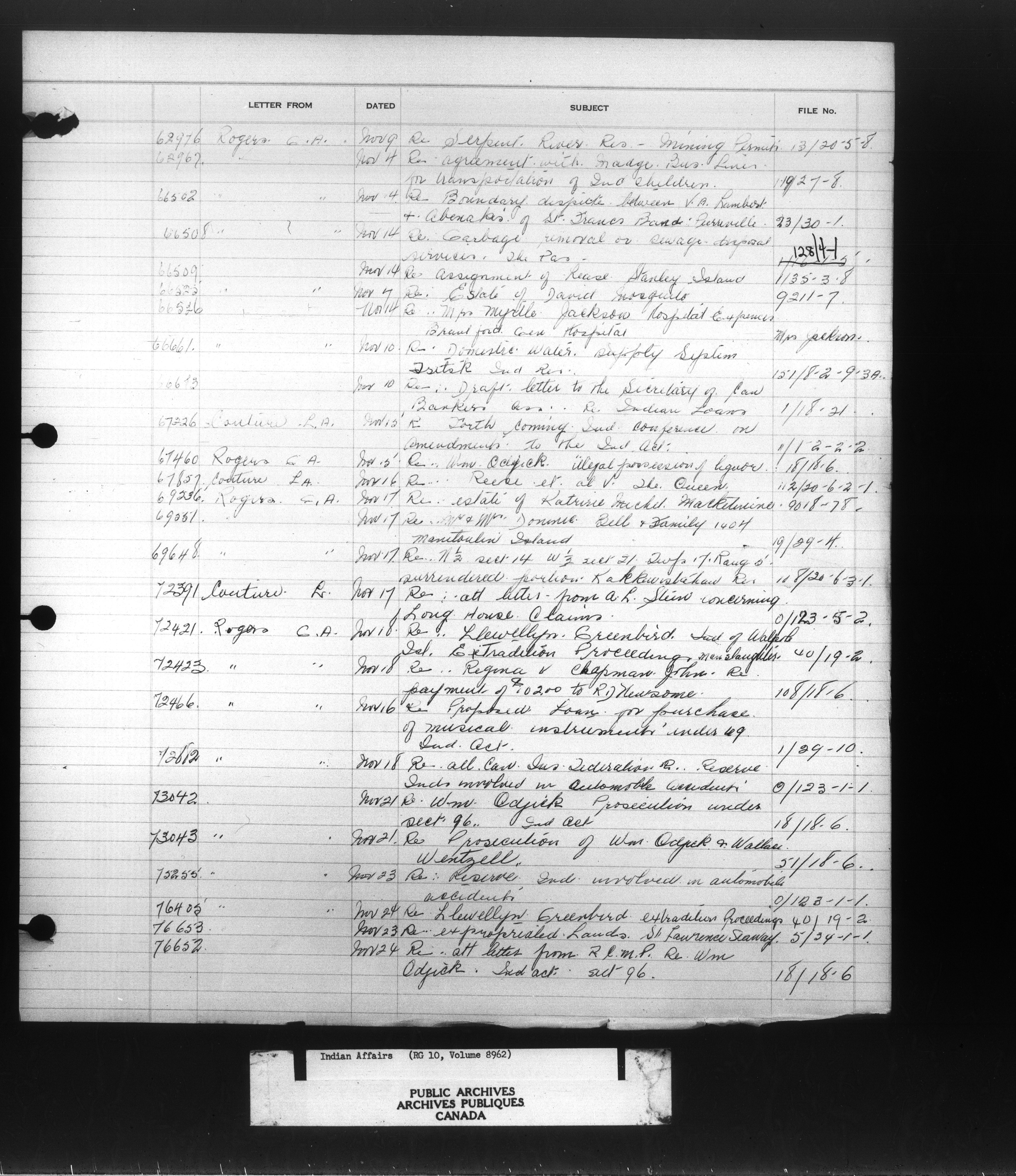 Department of Indian Affairs, Headquarters central registry system :registers, indices and indexed registers : C-10936