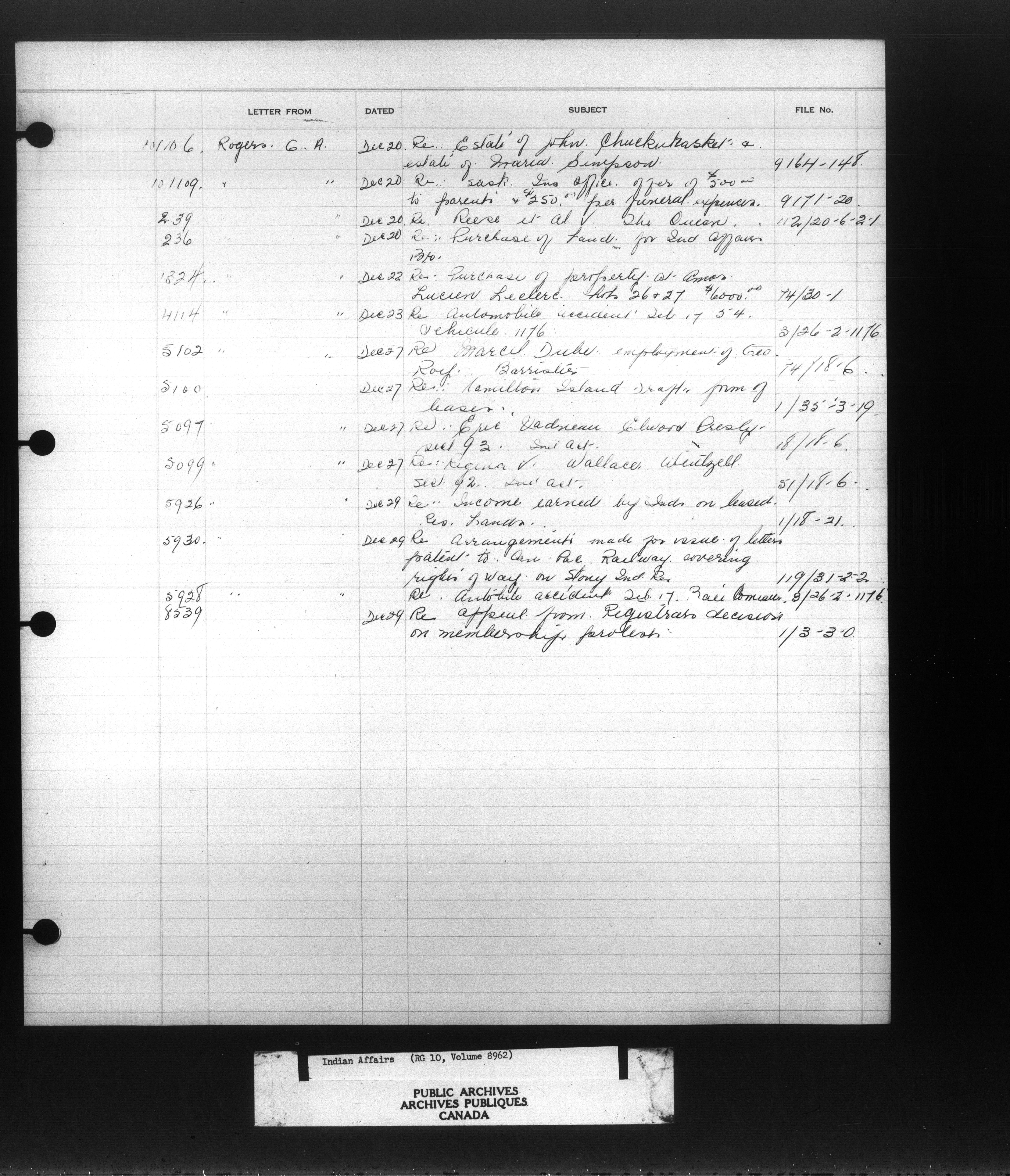 Department of Indian Affairs : Indexed Registers for Eastern Canada - 10936