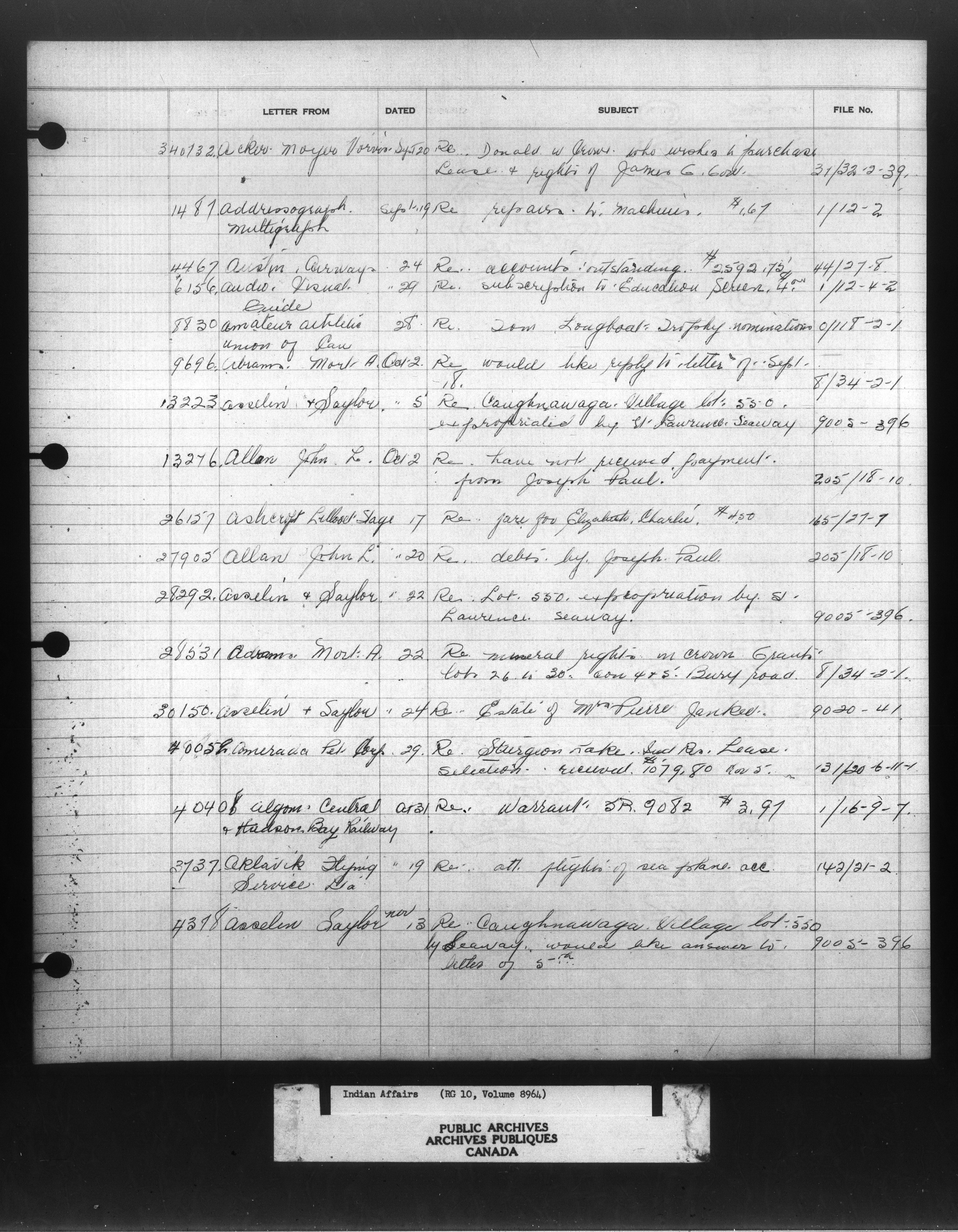 Department of Indian Affairs : Indexed Registers for Eastern Canada - 10938