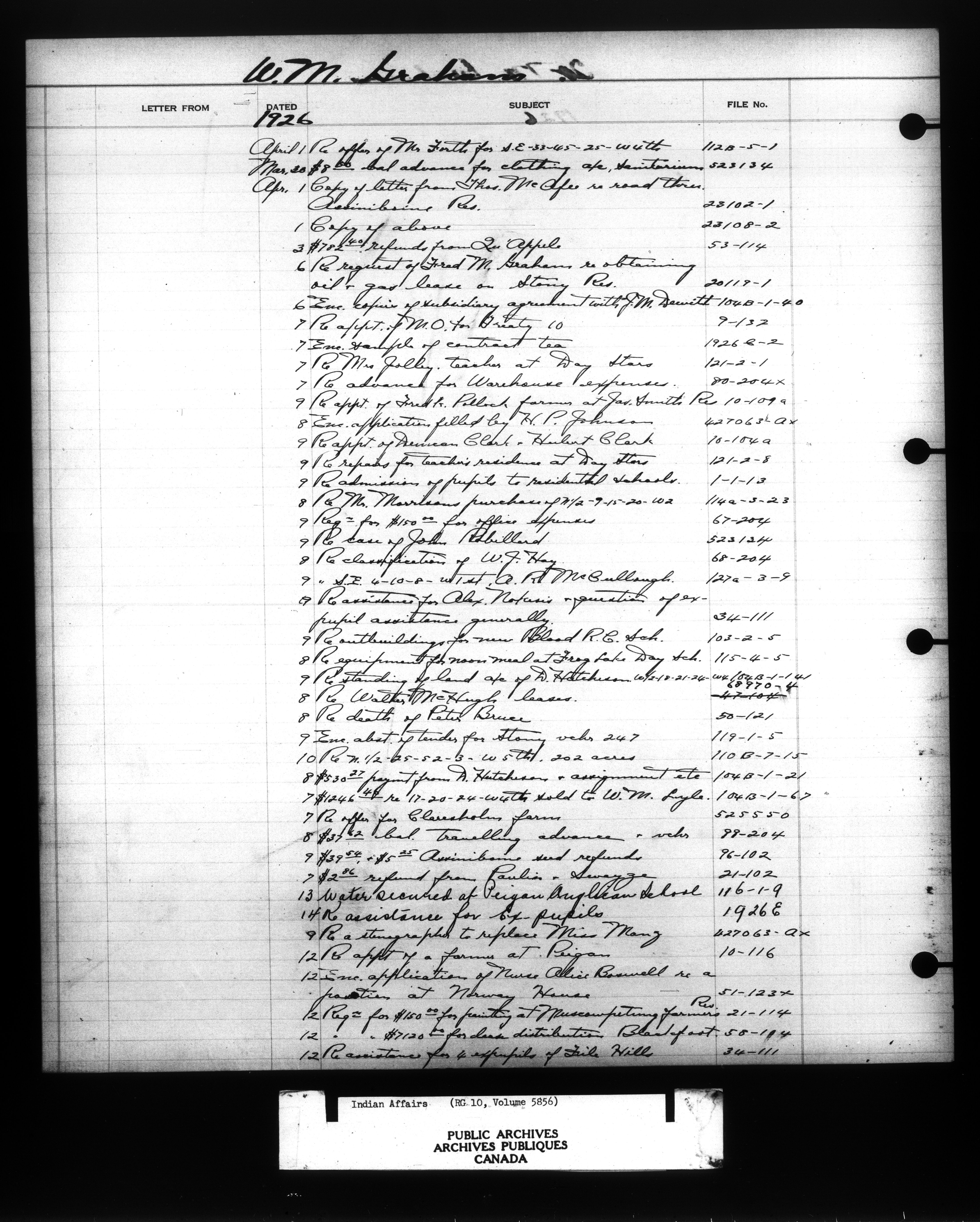 Department of Indian Affairs : Indexed Registers for Western Canada - 10943