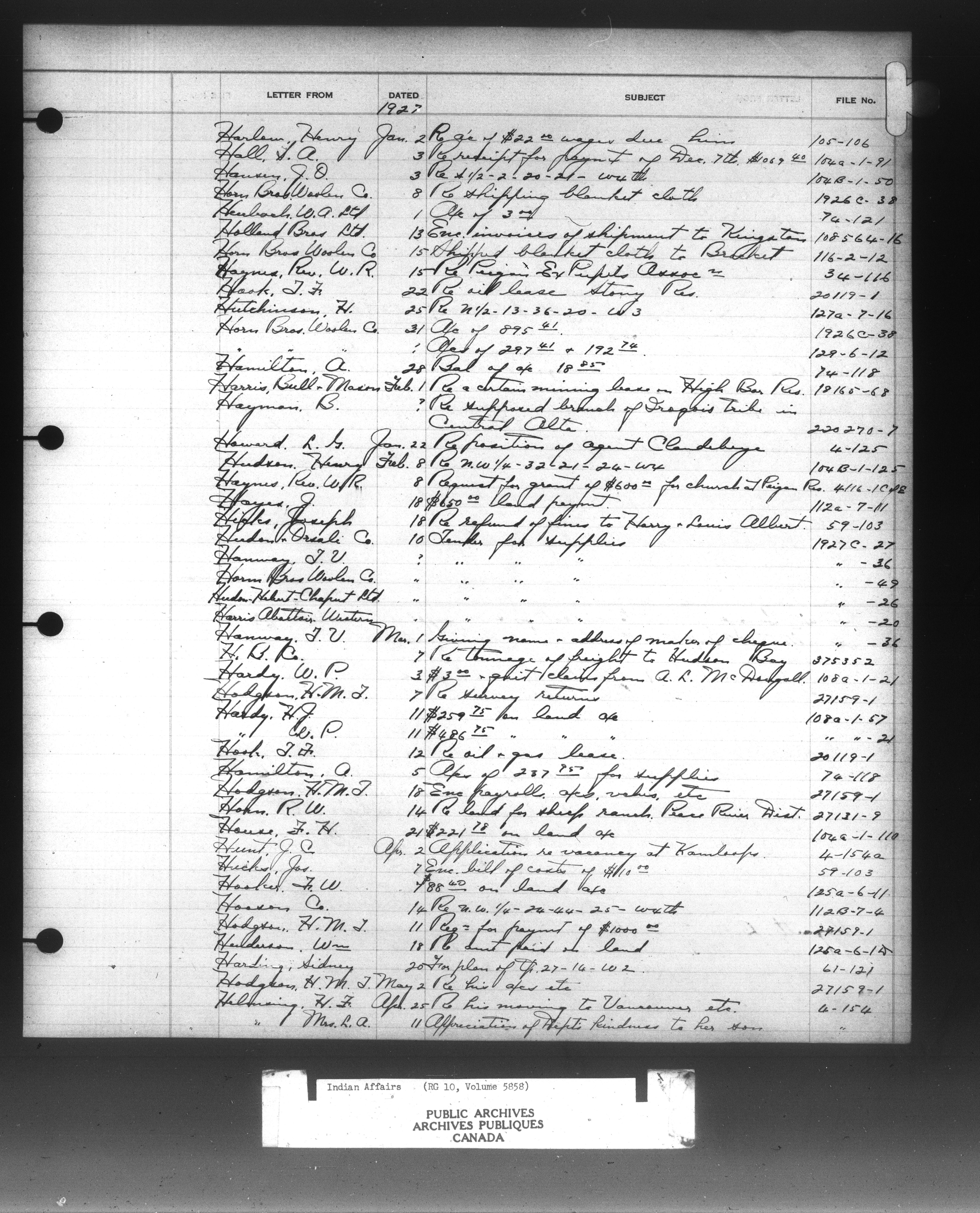 Department of Indian Affairs : Indexed Registers for Western Canada - 10944