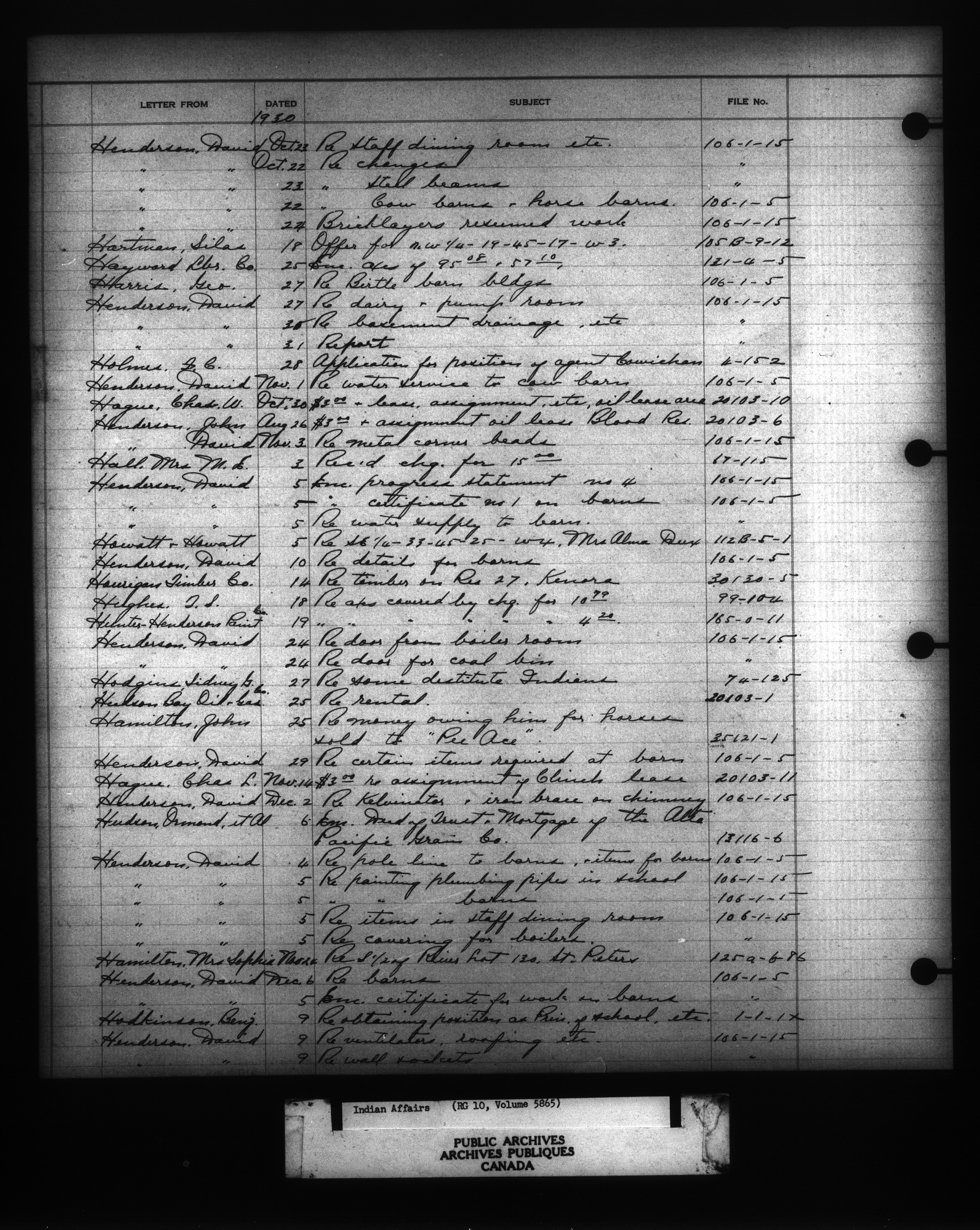 Department of Indian Affairs : Indexed Registers for Western Canada - 10945