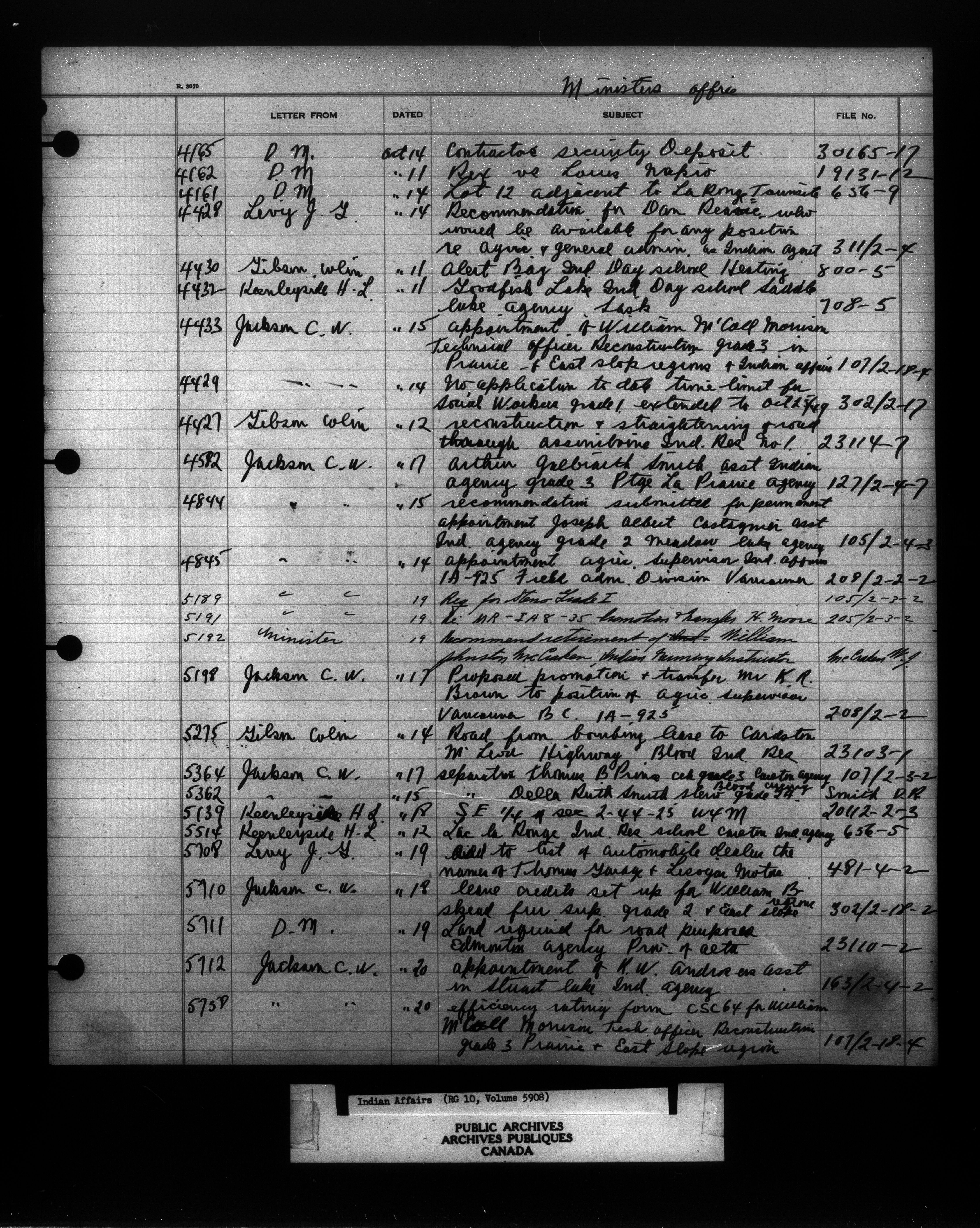 Department of Indian Affairs, Headquarters central registry system :registers, indices and indexed registers : C-10965