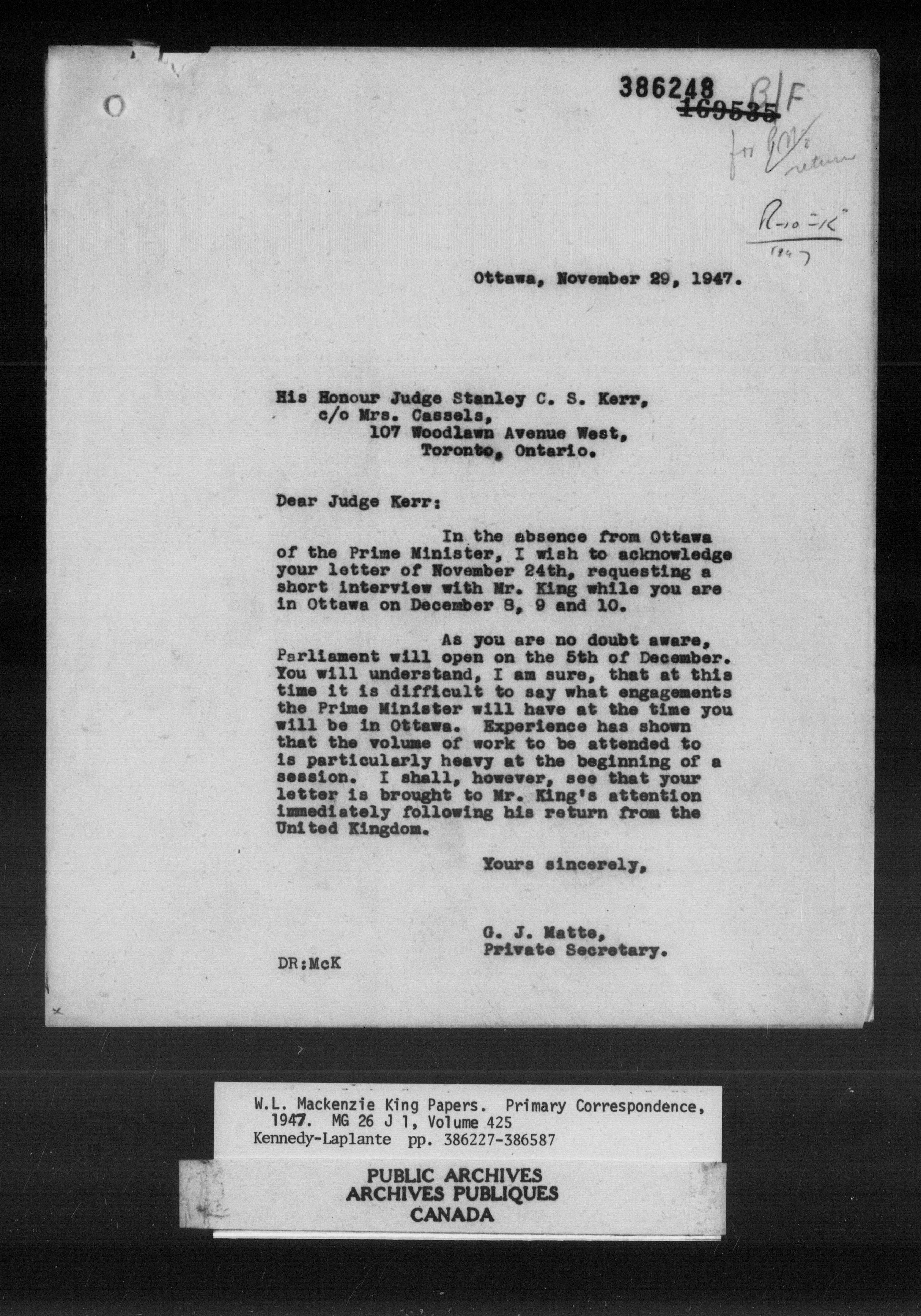 William Lyon Mackenzie King : Primary series correspondence (J1) - 11038