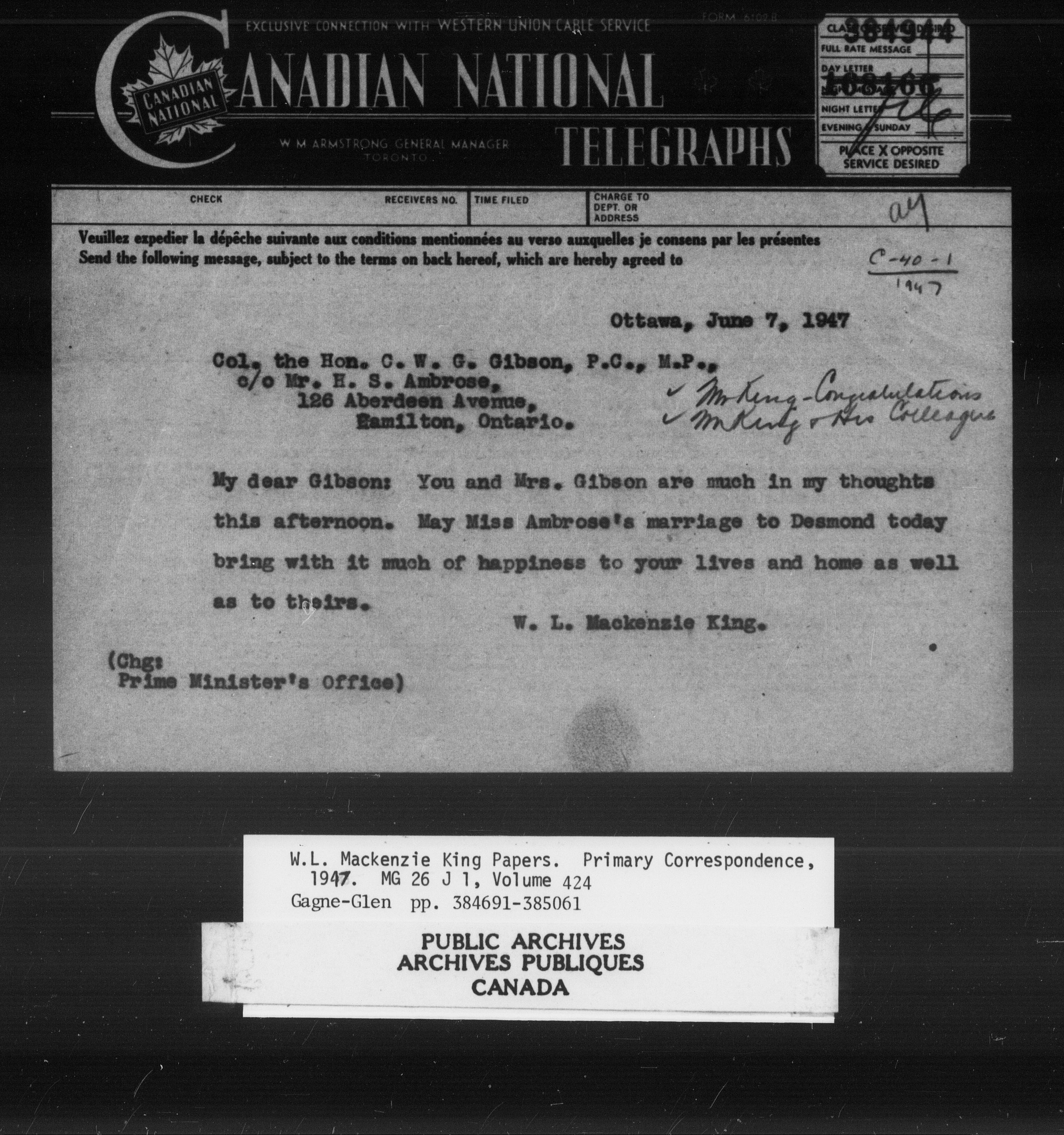 William Lyon Mackenzie King : Primary series correspondence (J1) - 11038