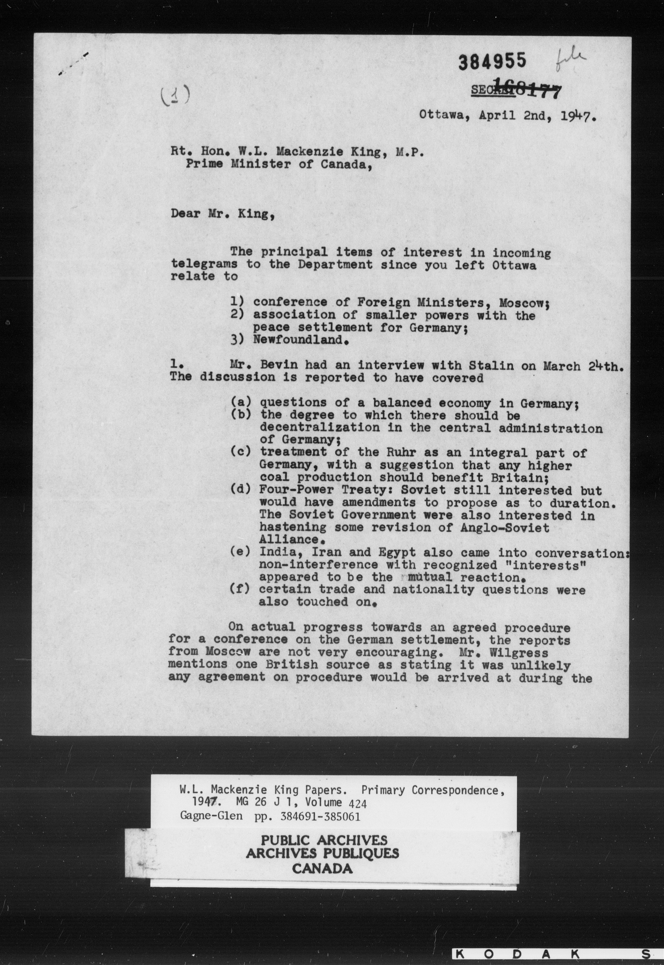 William Lyon Mackenzie King : Primary series correspondence (J1) - 11038