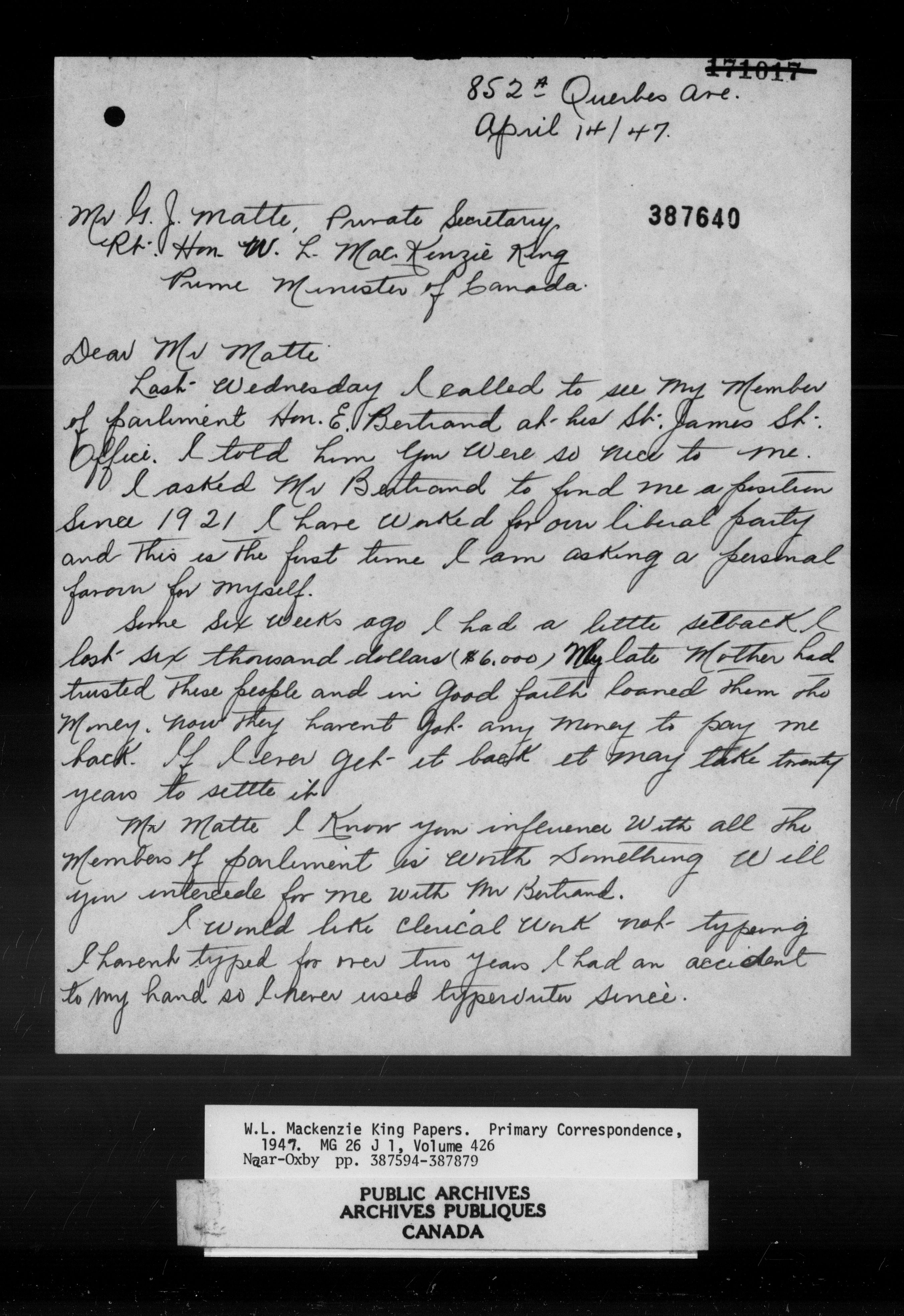 William Lyon Mackenzie King : Primary series correspondence (J1) - 11039