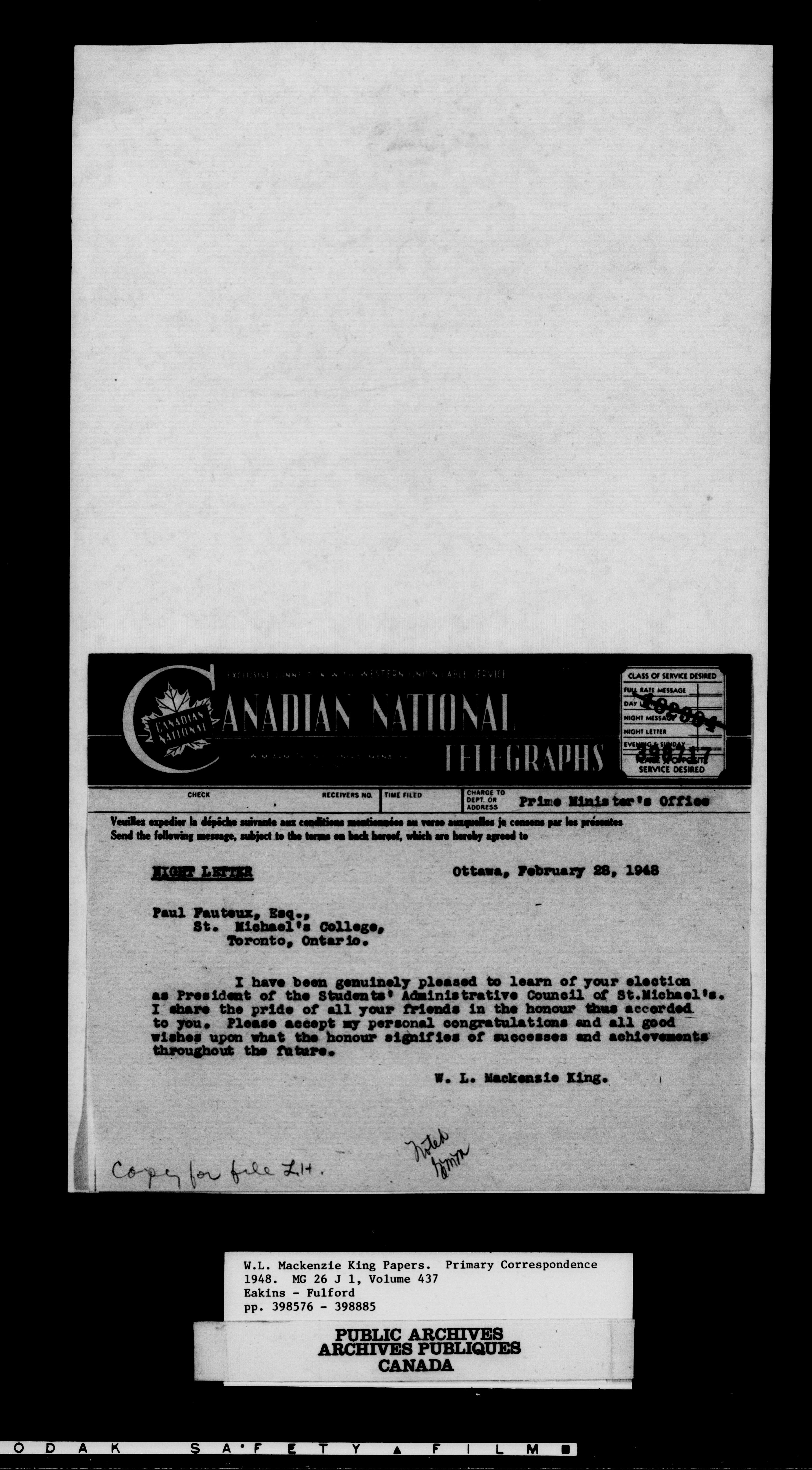 William Lyon Mackenzie King : Primary series correspondence (J1) - 11047
