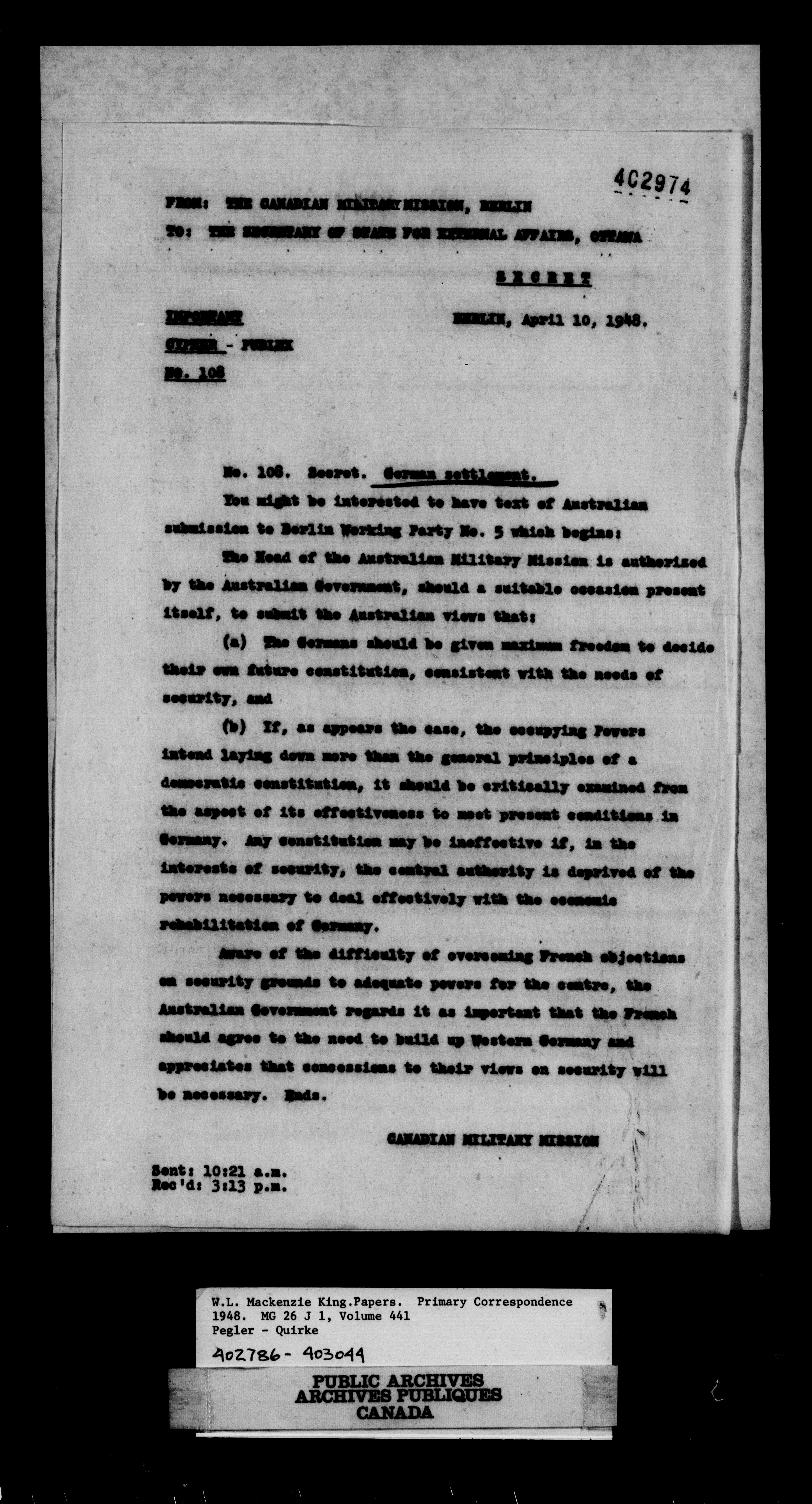 William Lyon Mackenzie King : Primary series correspondence (J1) : C-11050