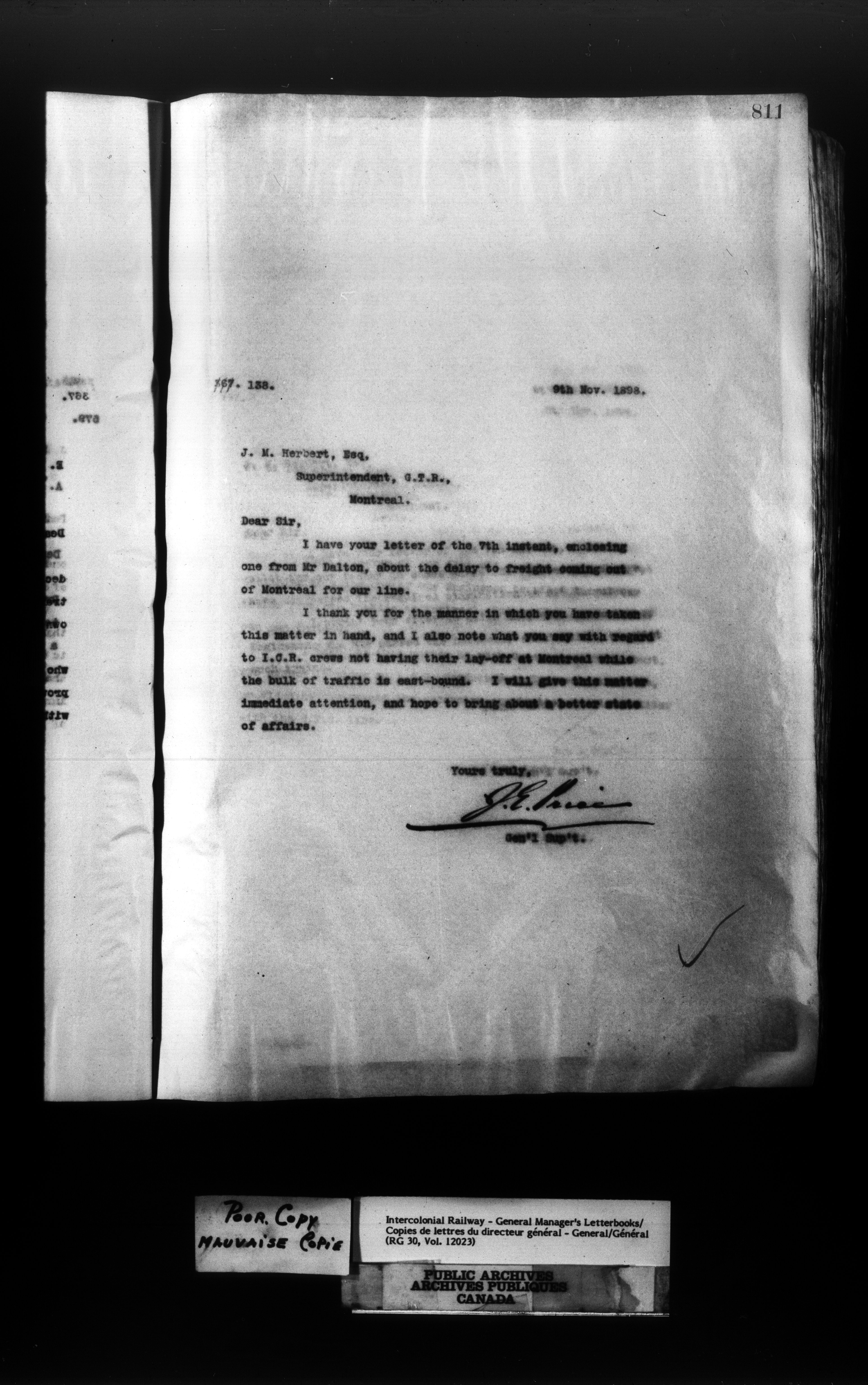 Canadian Government Railways : Office of the General Manager, Outward correspondence - 11398