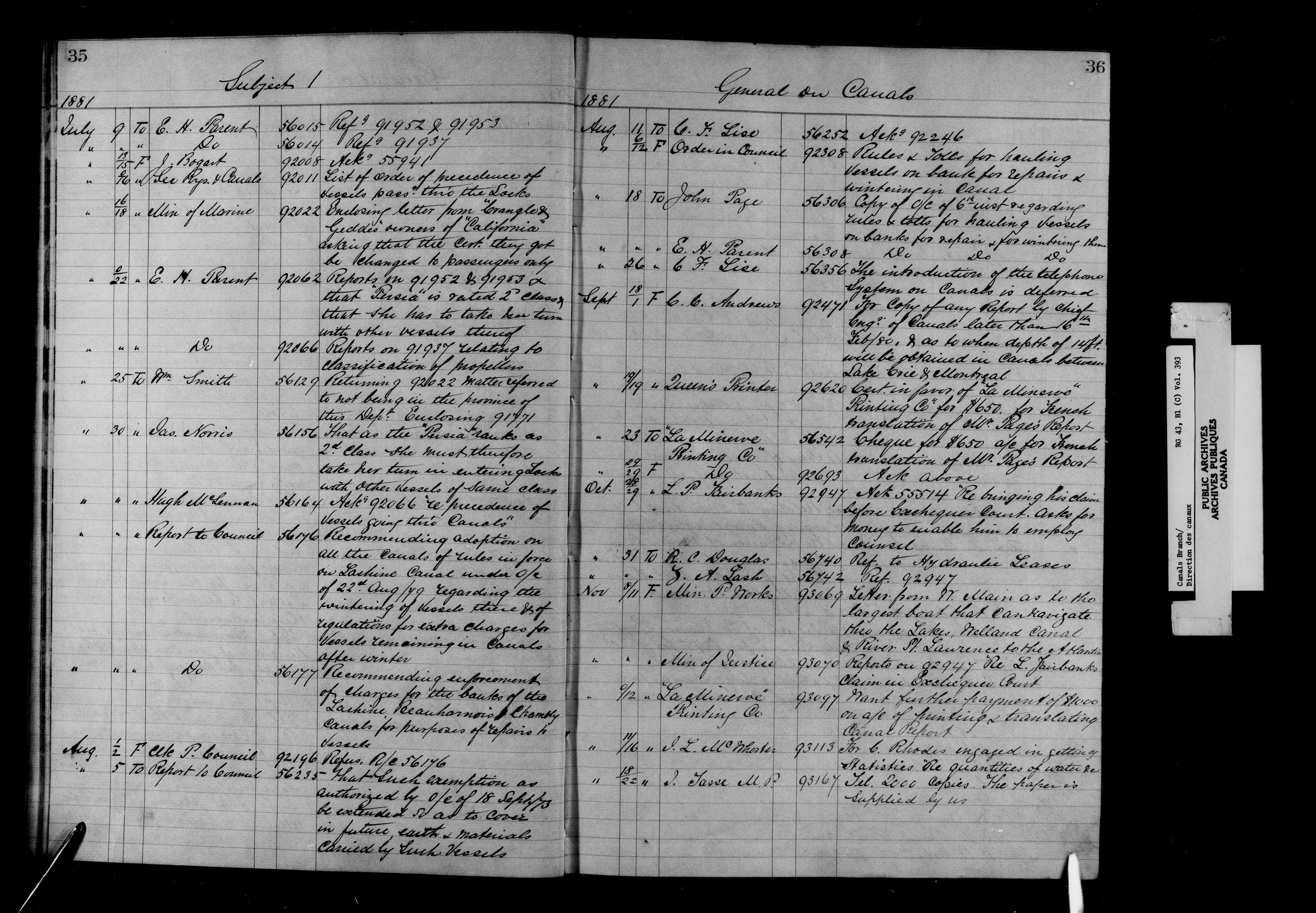 Department of Railways and Canals, Canal Branch : correspondence, registers and indexes, 1838-1936 : C-11696