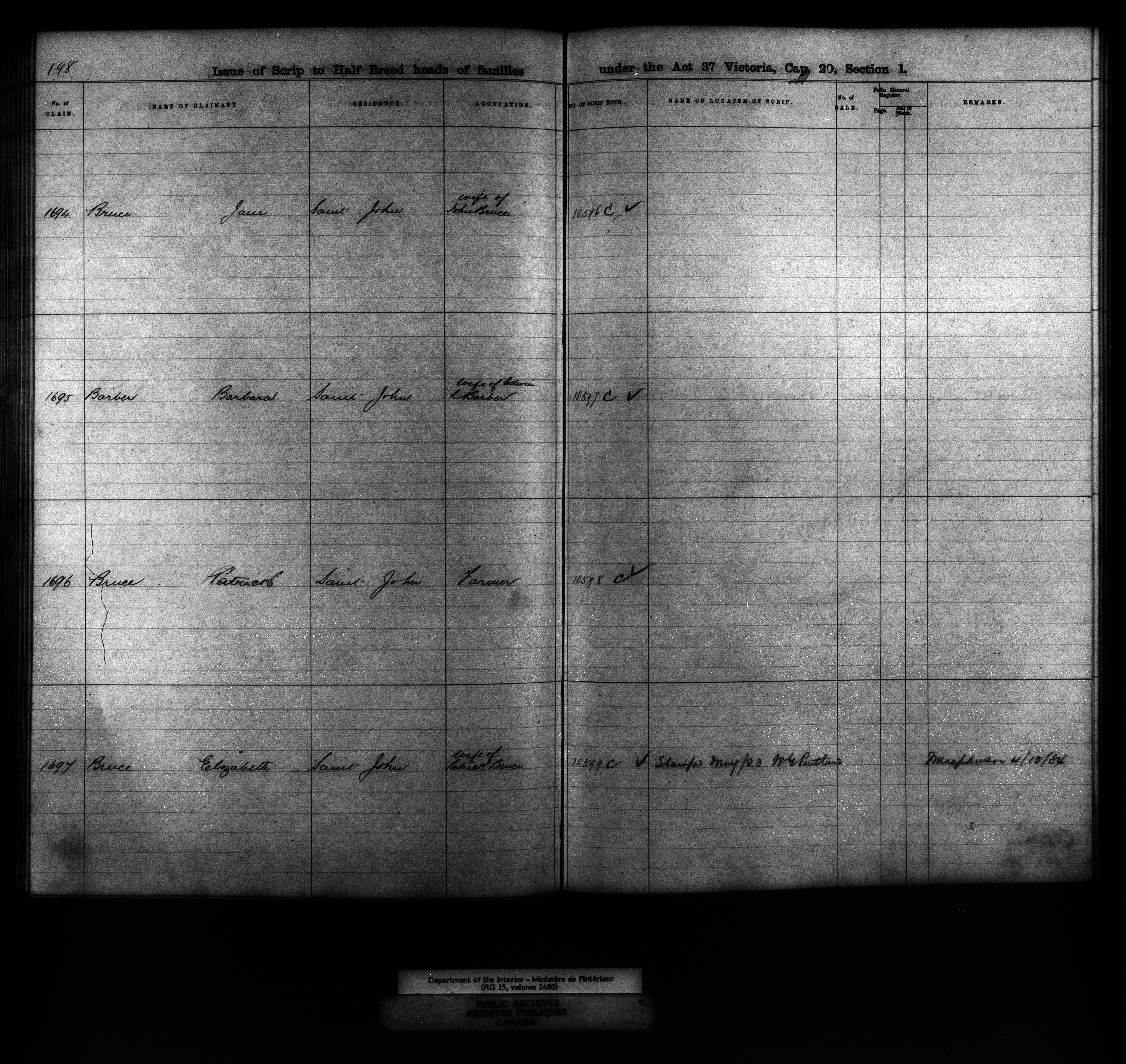 Department of the Interior : Registers and indexes relating to Métis and Original White Settlers land records, 1877-1927 - 11873