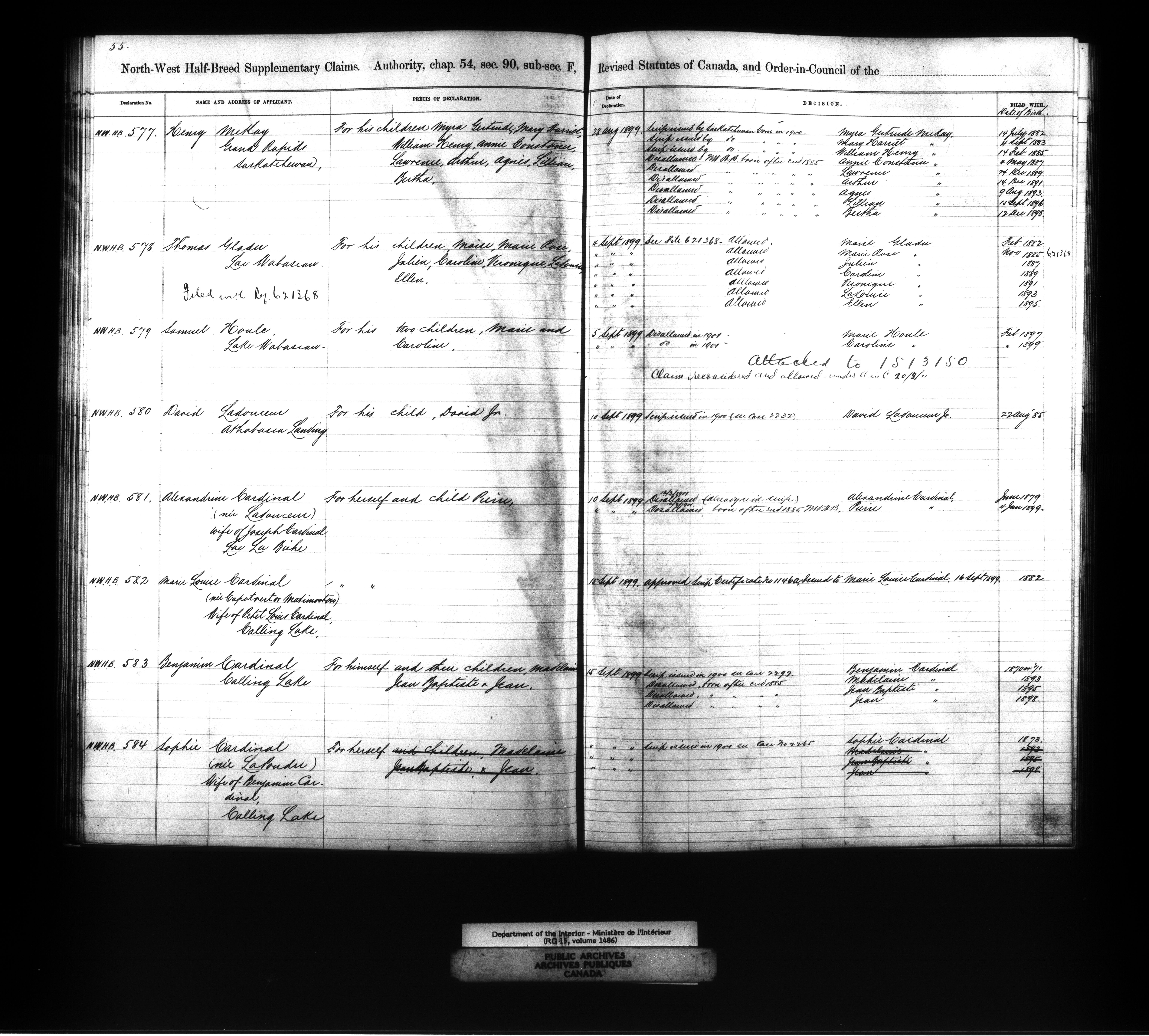 Department of the Interior : Registers and indexes relating to Métis and Original White Settlers land records, 1877-1927 : C-11874