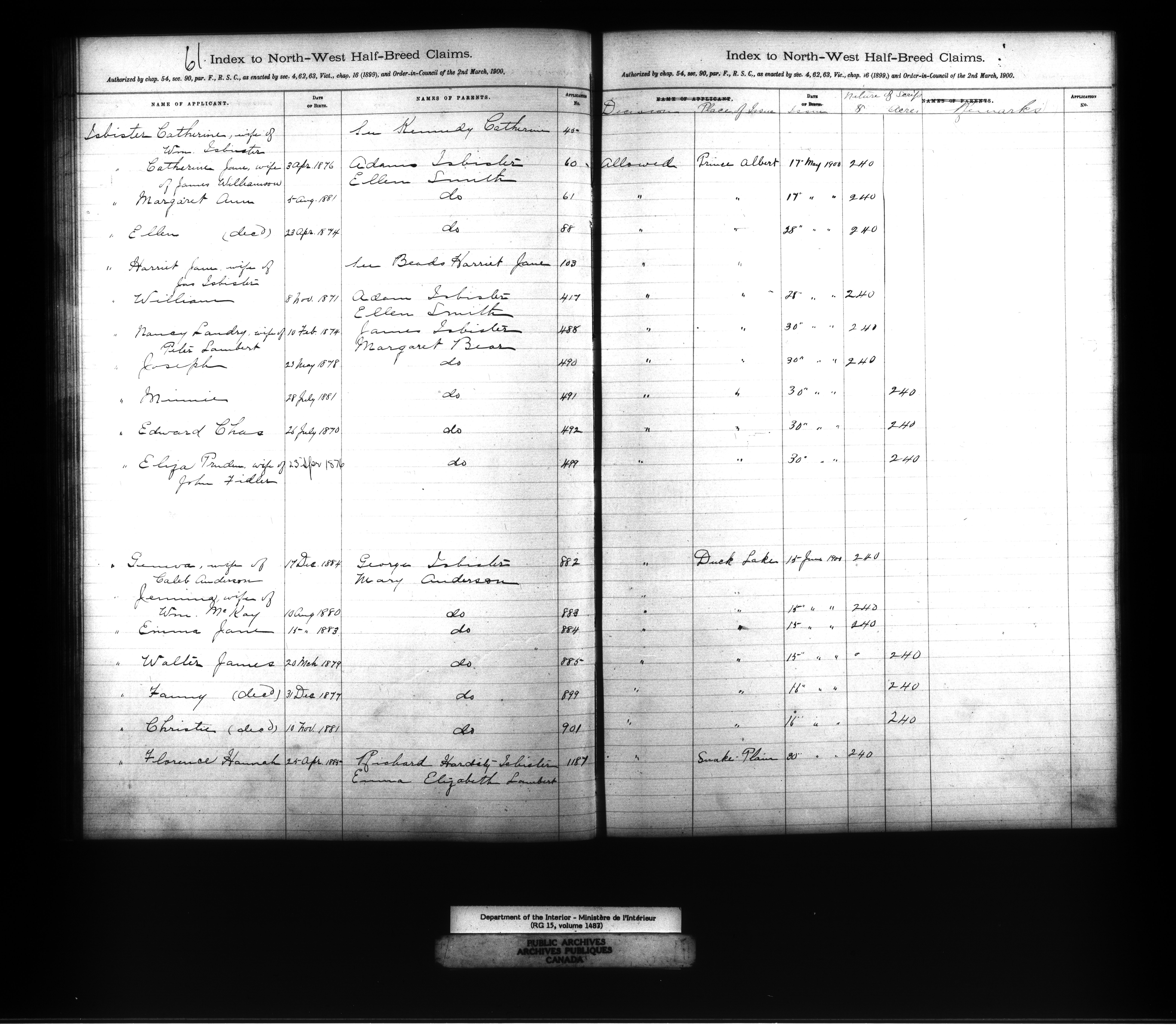 Department of the Interior : Registers and indexes relating to Métis and Original White Settlers land records, 1877-1927 : C-11874