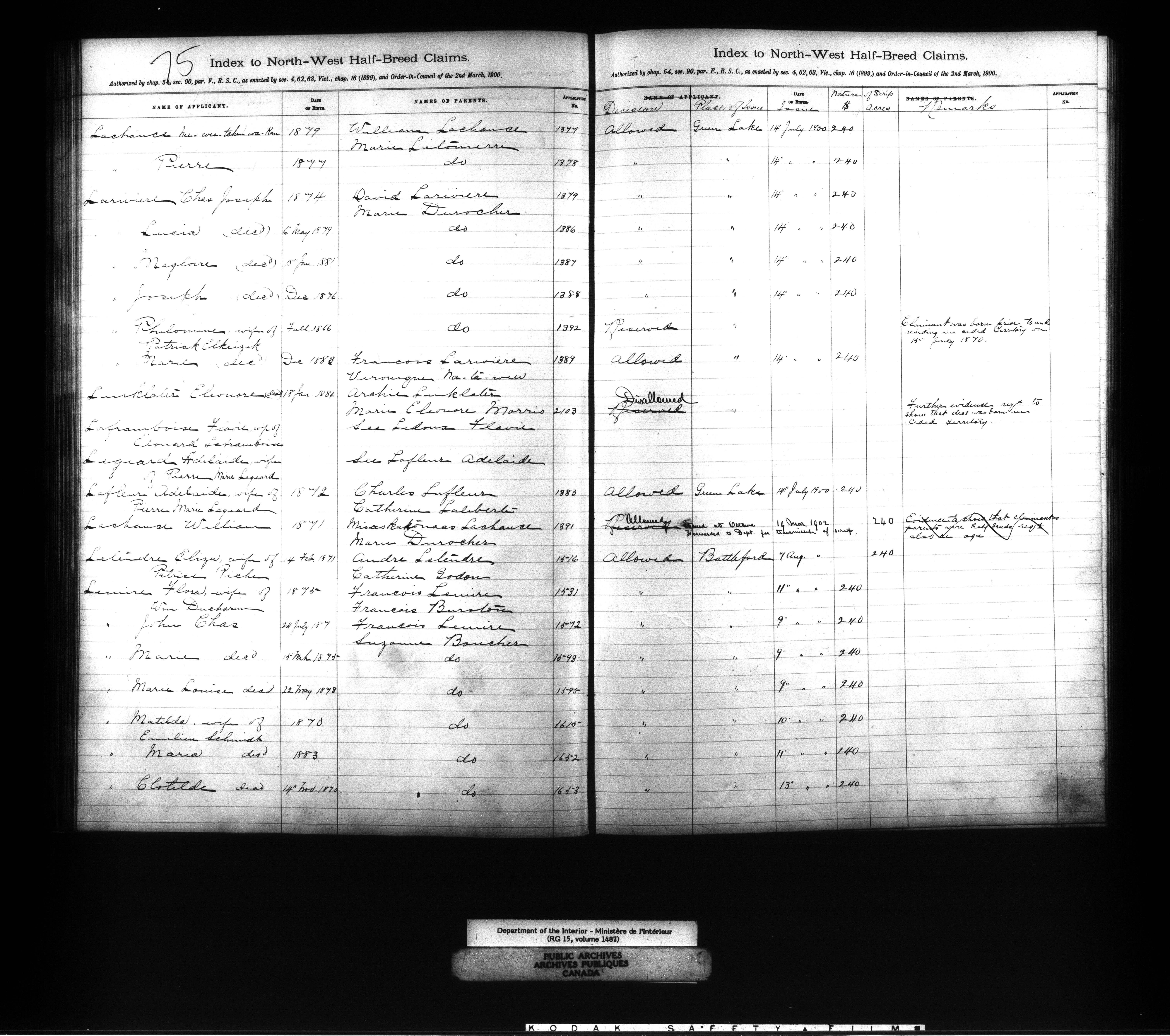 Department of the Interior : Registers and indexes relating to Métis and Original White Settlers land records, 1877-1927 - 11874
