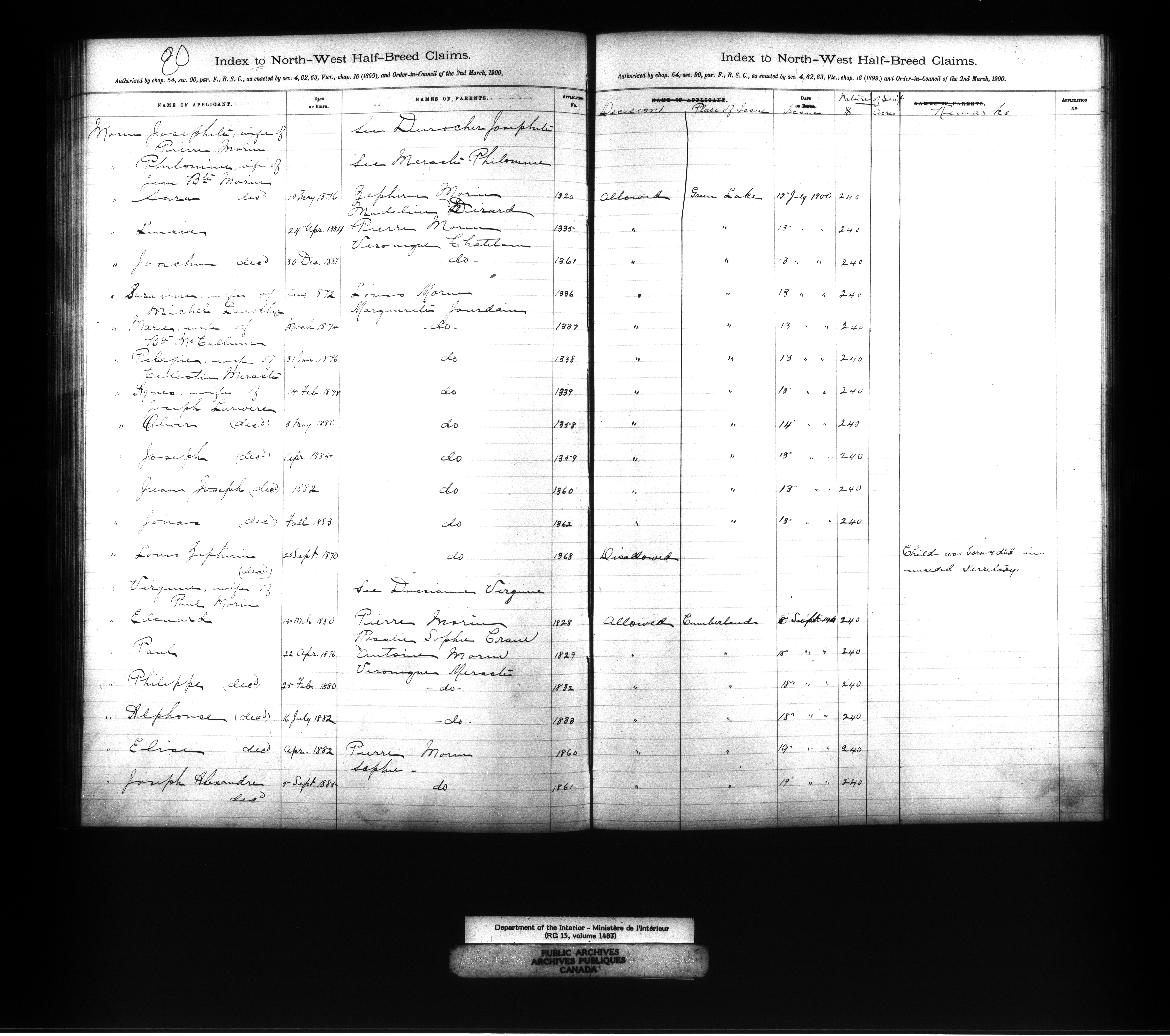 Department of the Interior : Registers and indexes relating to Métis and Original White Settlers land records, 1877-1927 - 11874