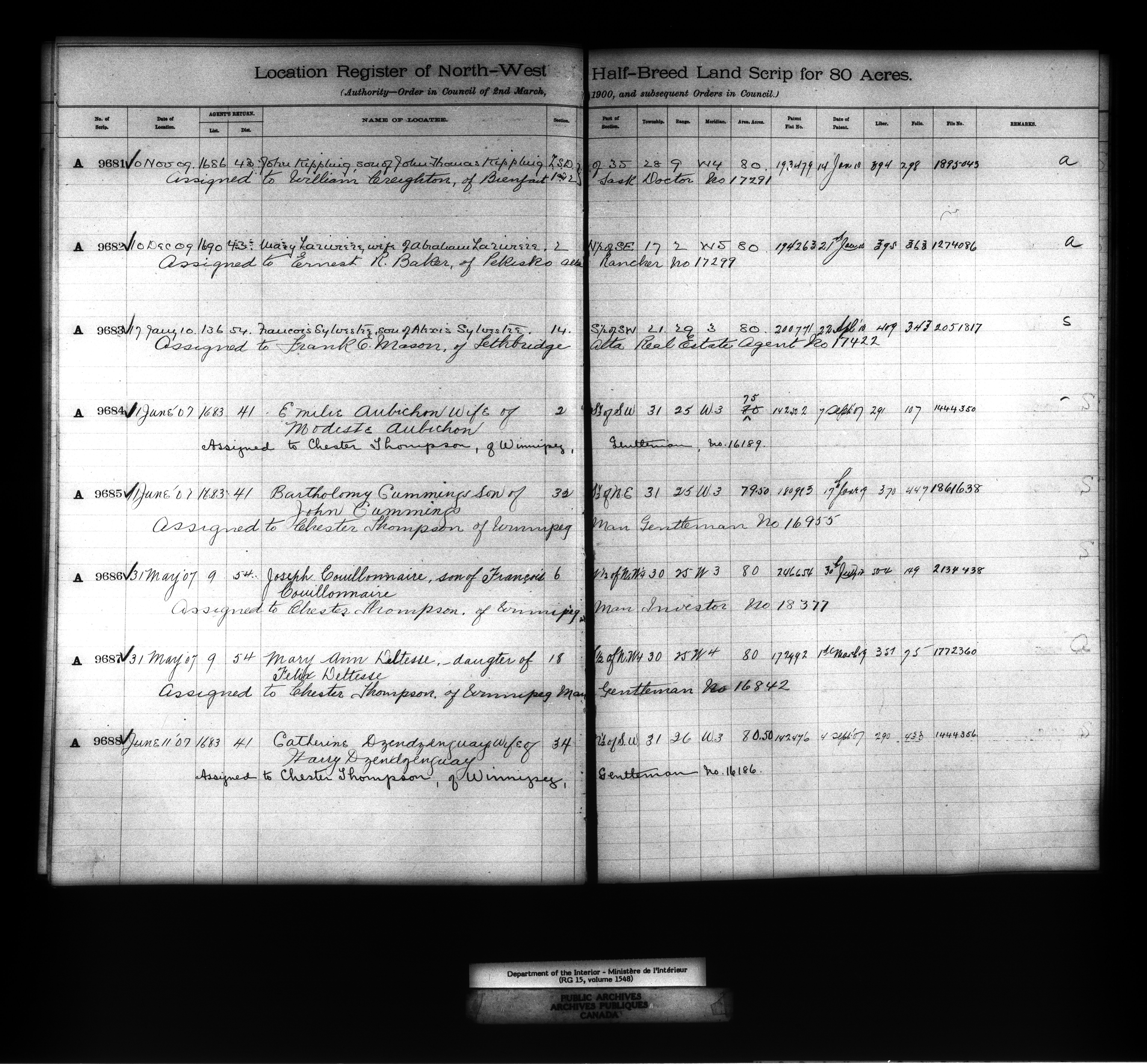 Department of the Interior : Registers and indexes relating to Métis and Original White Settlers land records, 1877-1927 - 11884