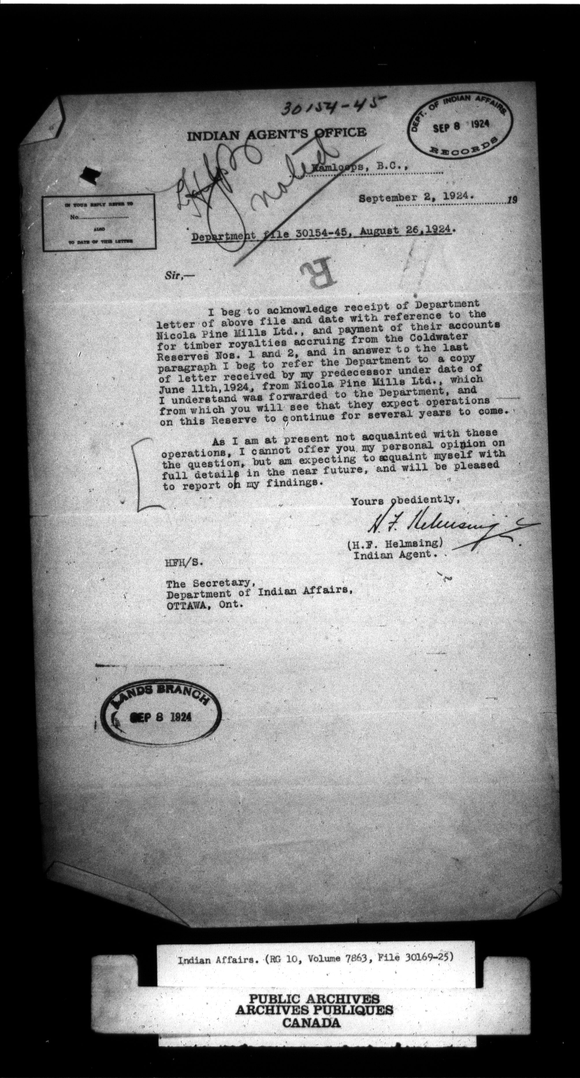 Nicola Agency - Correspondence and statistics regarding timber on Coldwater Reserves #1 and 2