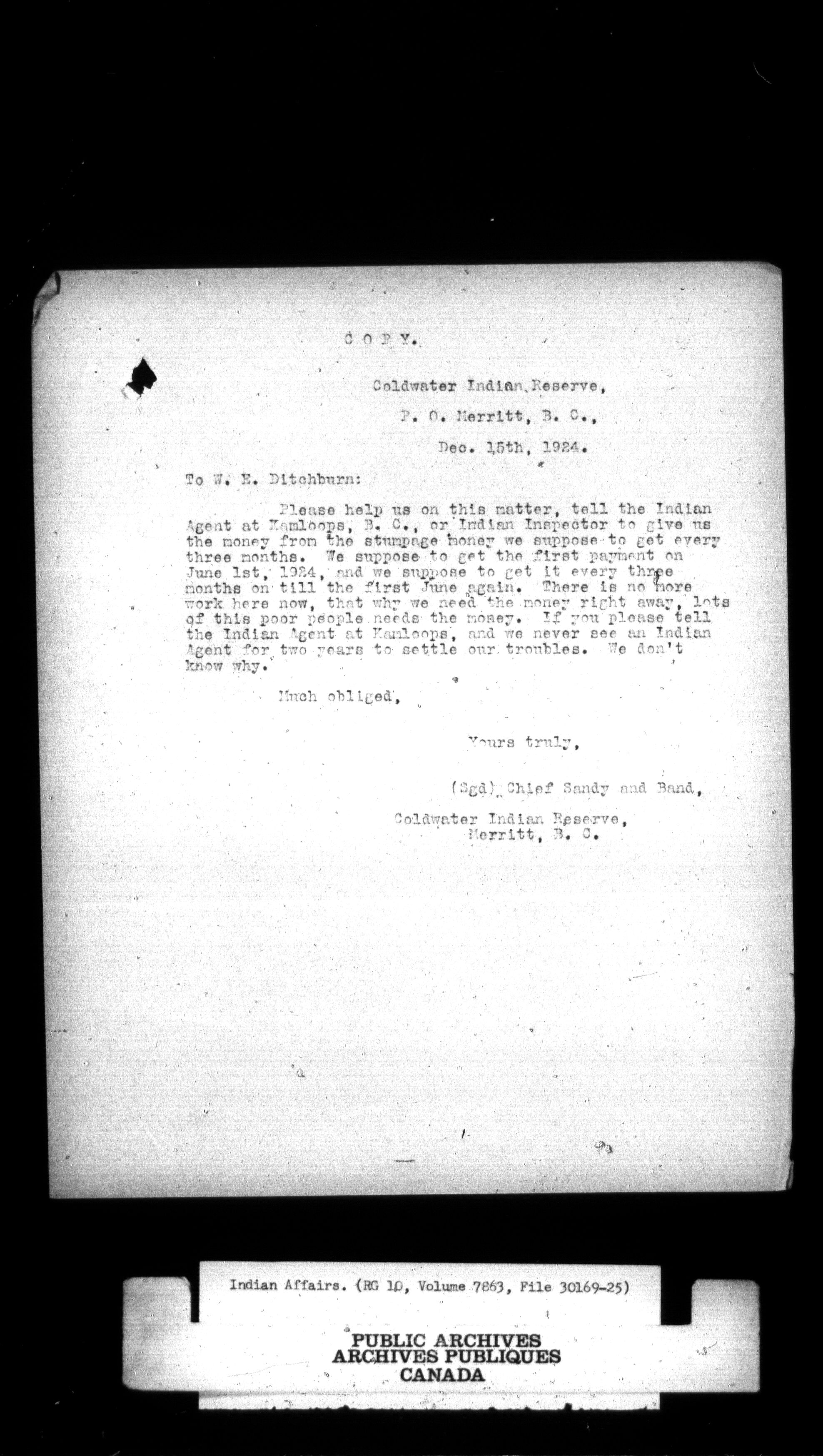 Nicola Agency - Correspondence and statistics regarding timber on Coldwater Reserves #1 and 2
