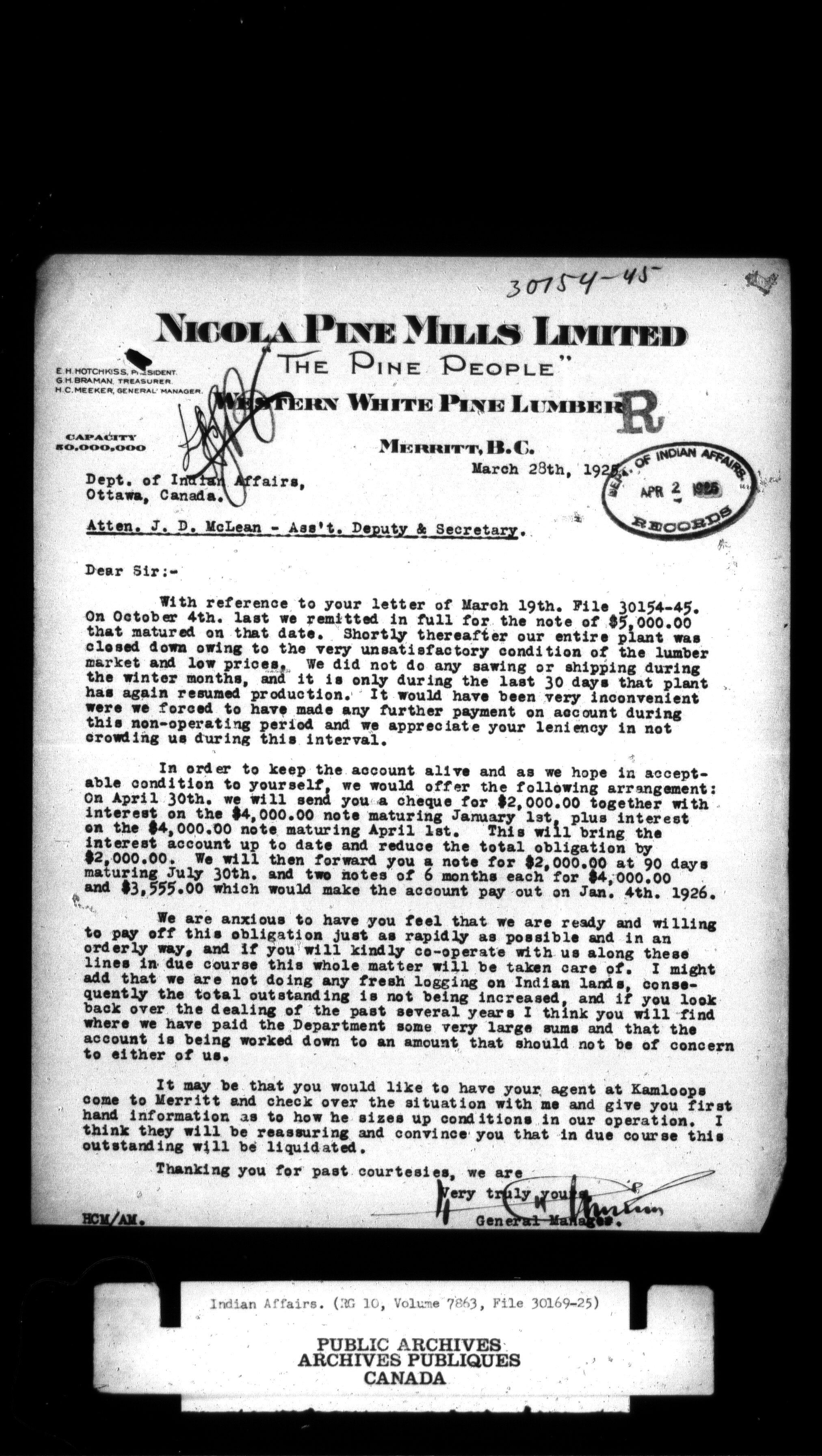 Nicola Agency - Correspondence and statistics regarding timber on Coldwater Reserves #1 and 2