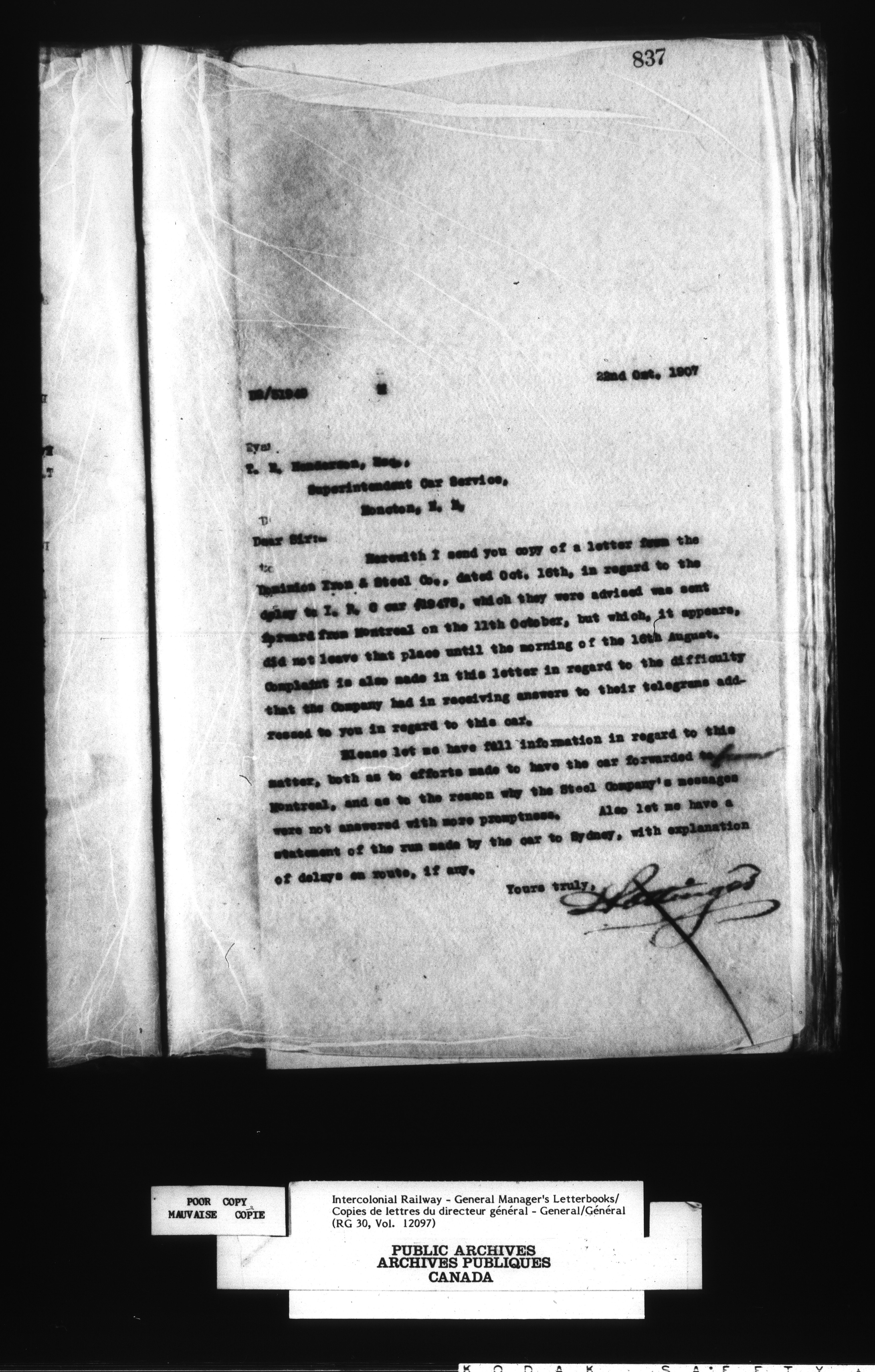 Canadian Government Railways : Office of the Chief Superintendent, Outward correspondence : C-12438