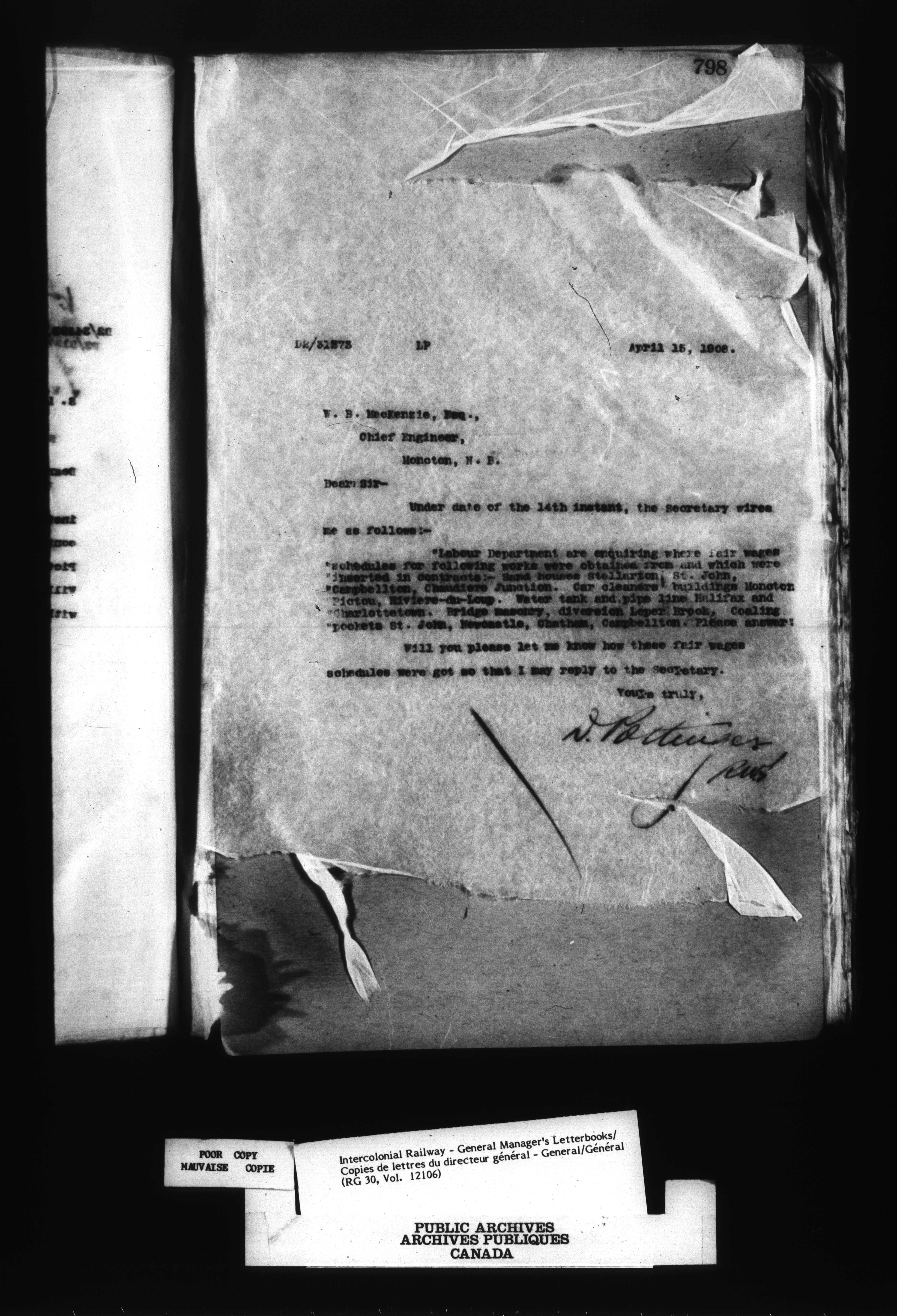 Canadian Government Railways : Office of the Chief Superintendent, Outward correspondence : C-12444