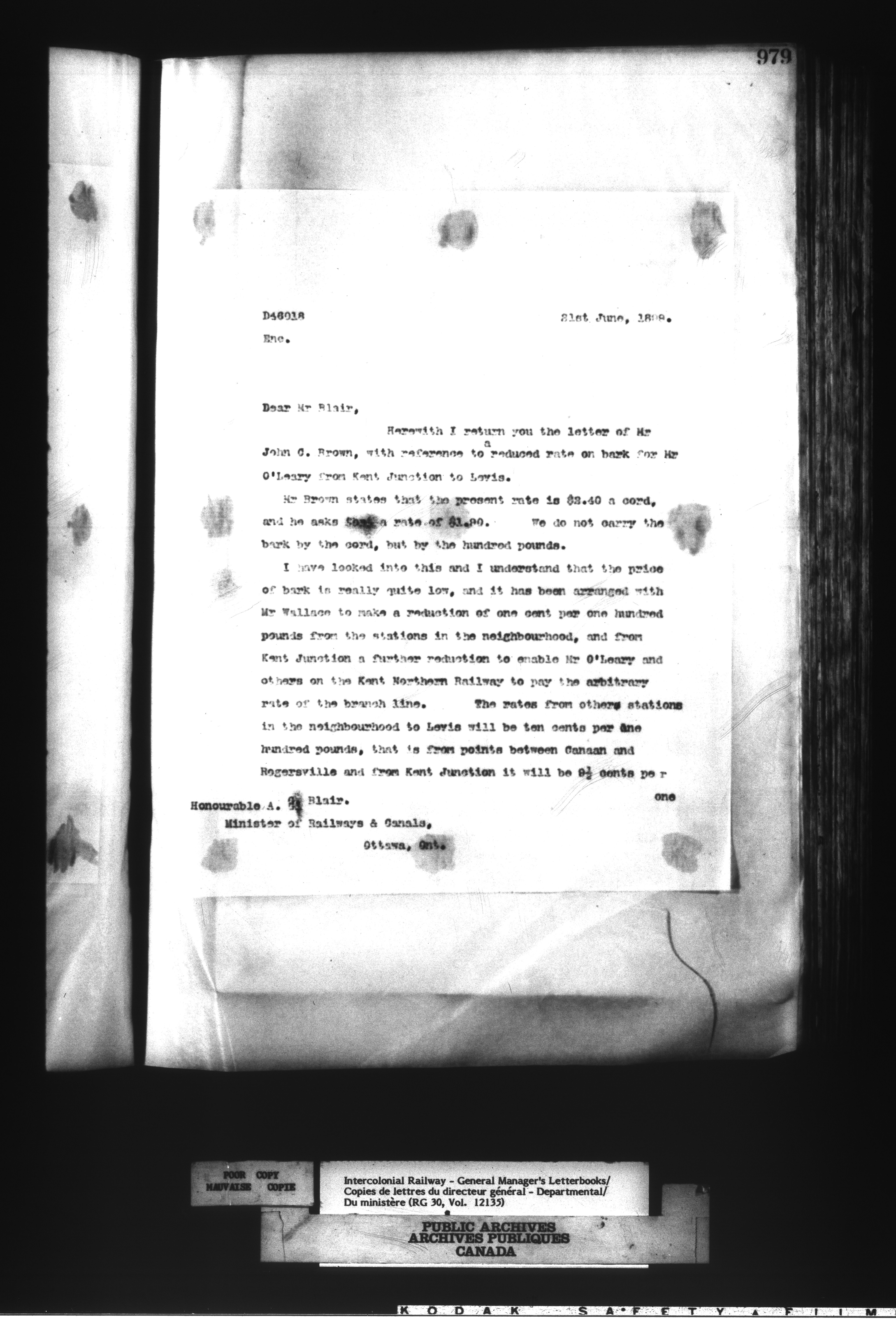 Canadian Government Railways : Office of the Chief Superintendent, Outward correspondence : C-12469