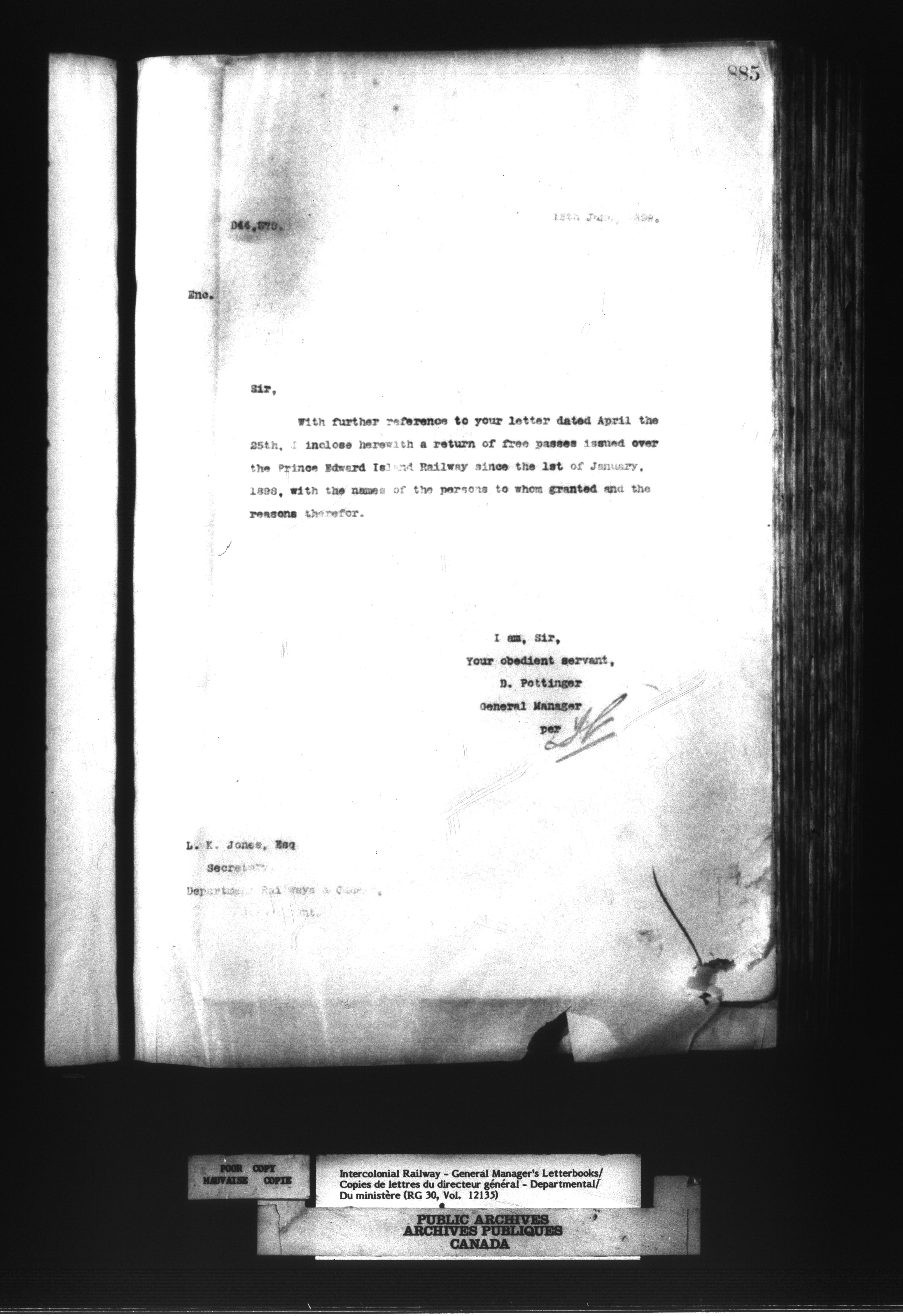 Canadian Government Railways : Office of the General Manager, Outward correspondence with Department of Railways and Canals, 1893-1913 - 12469